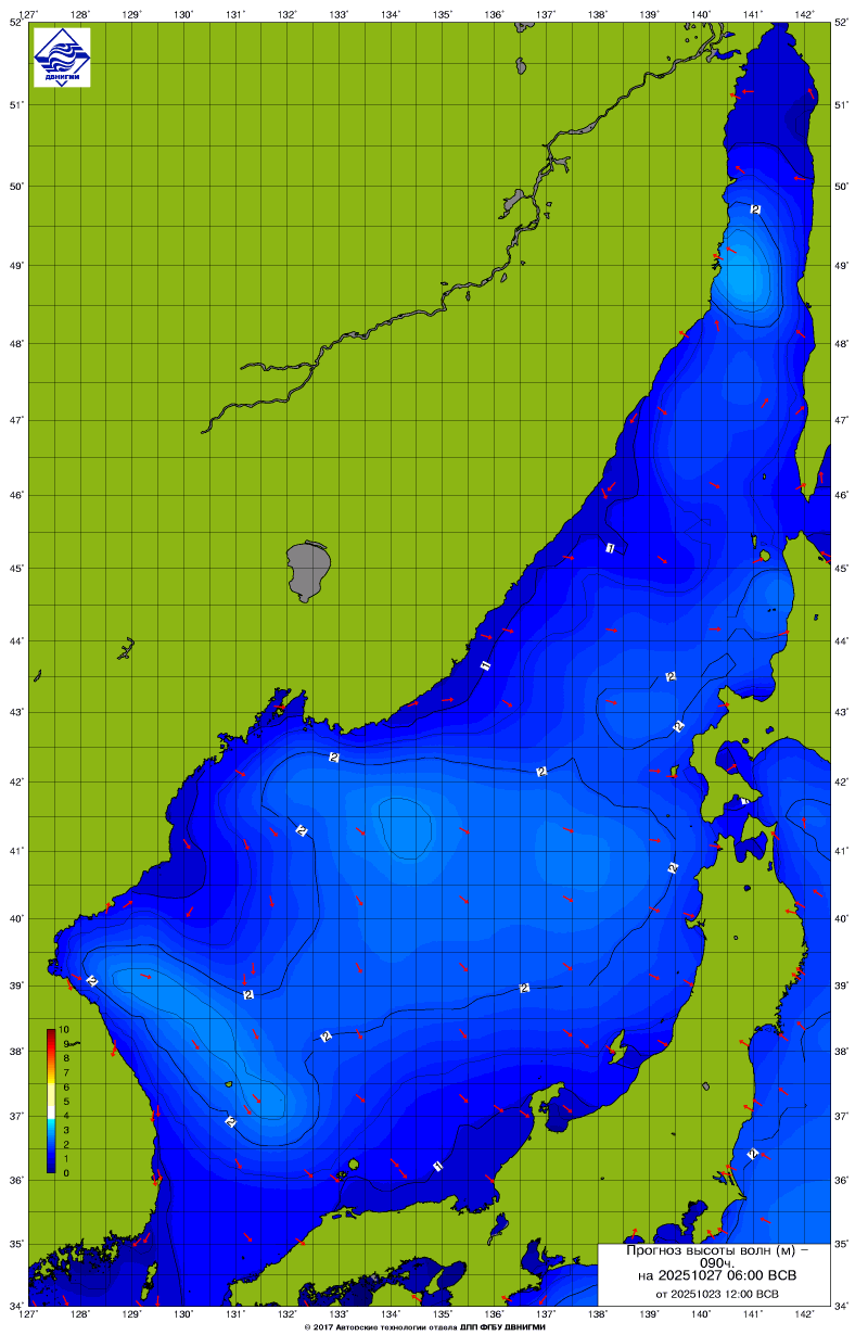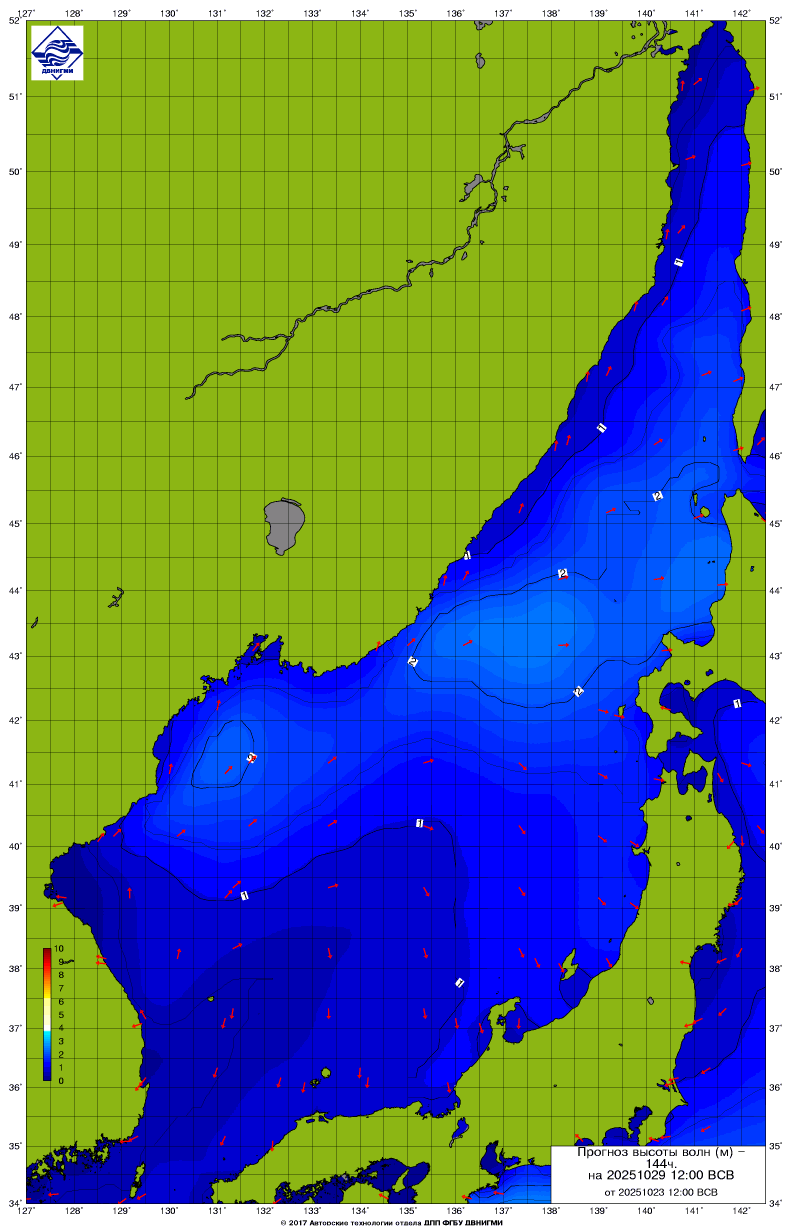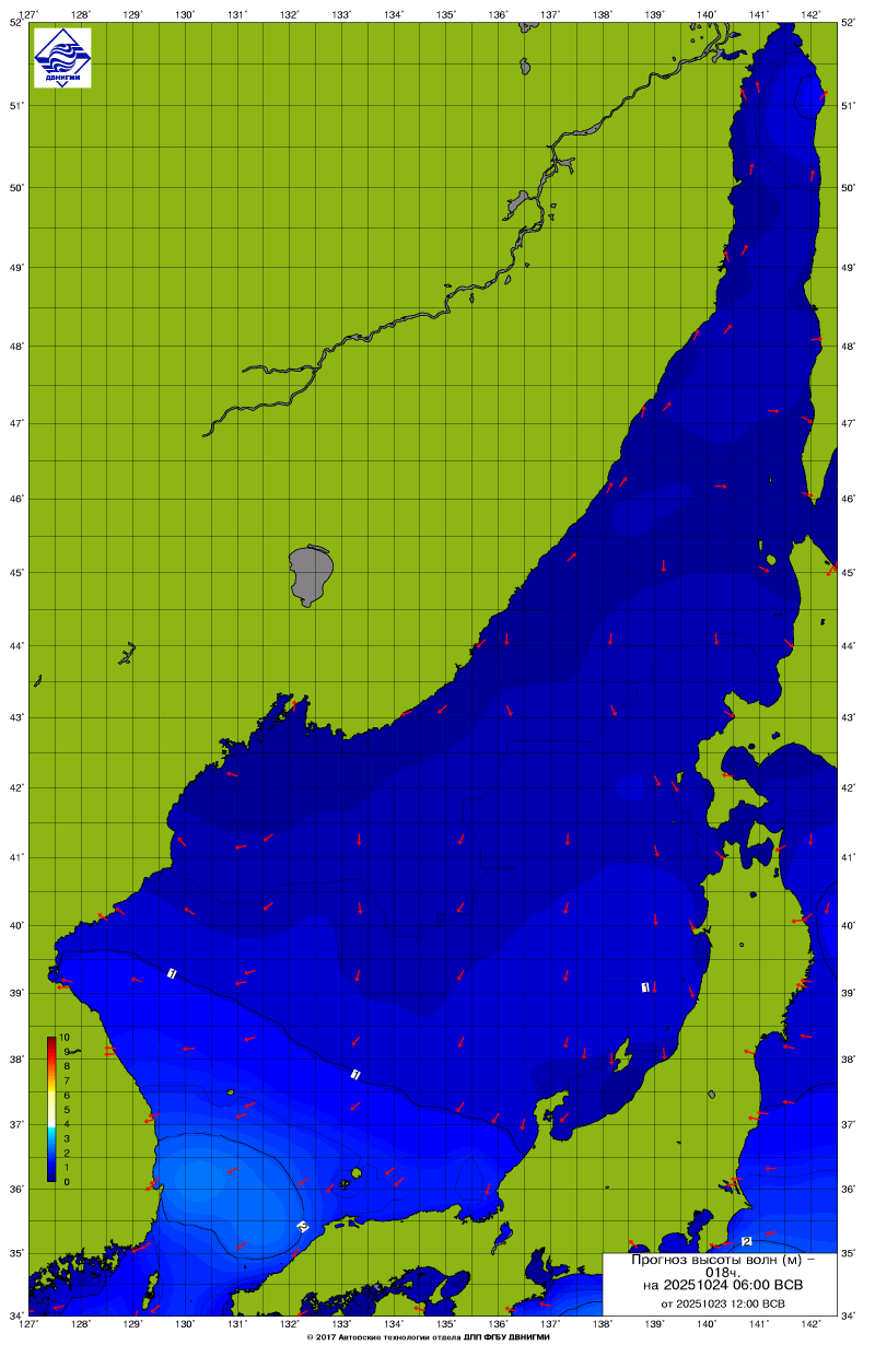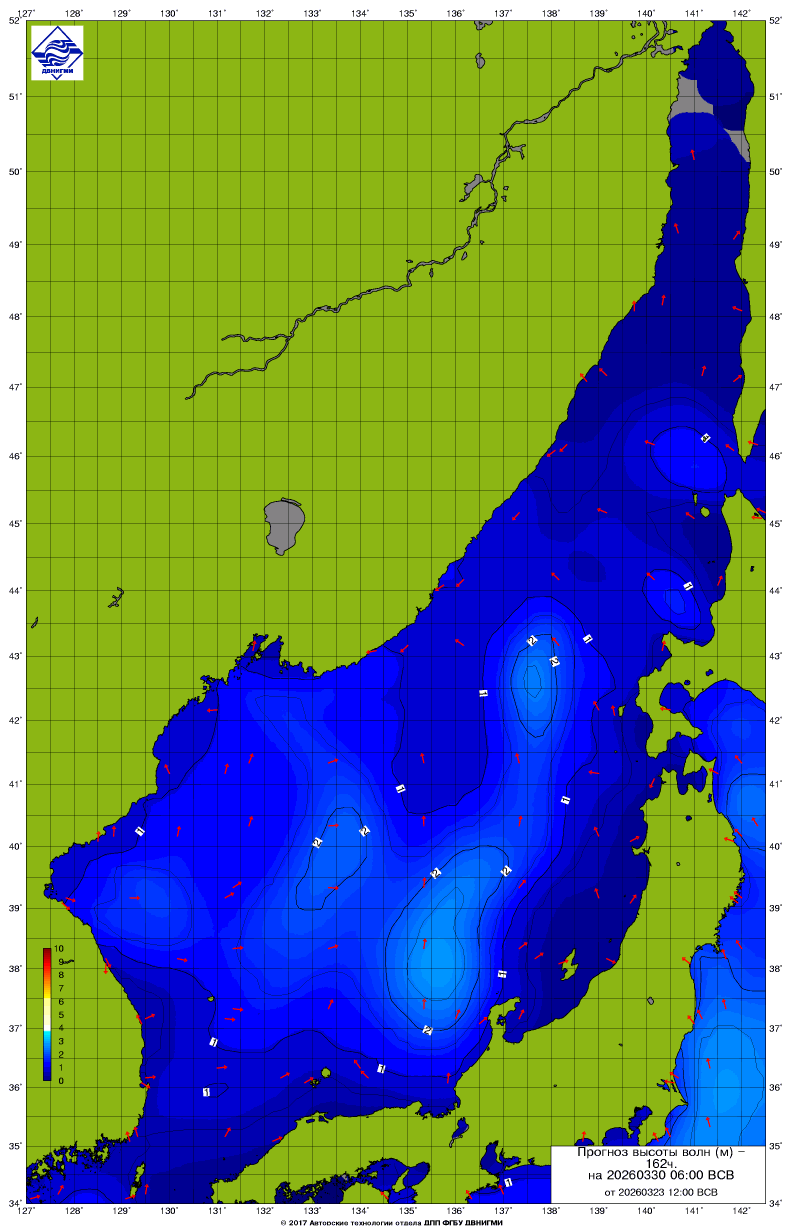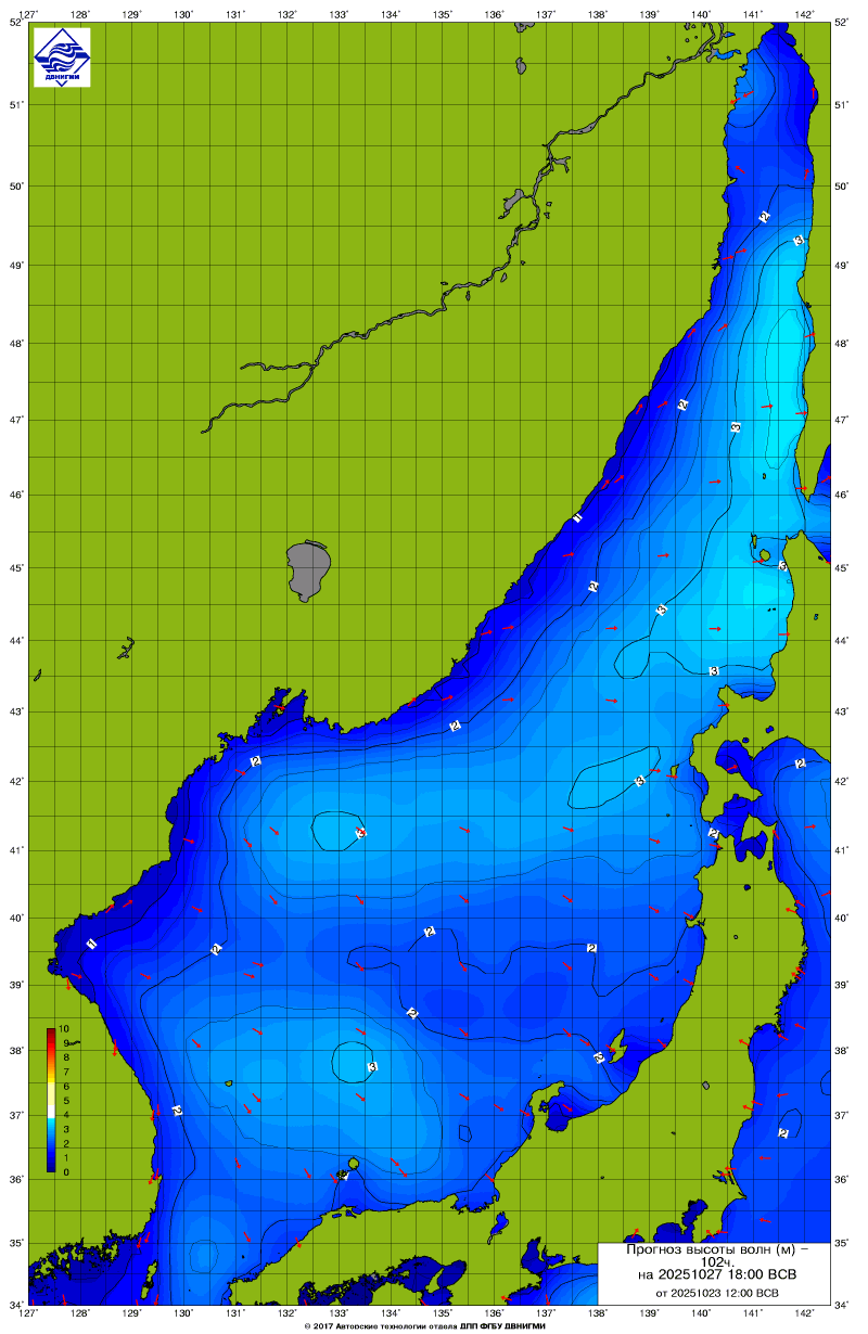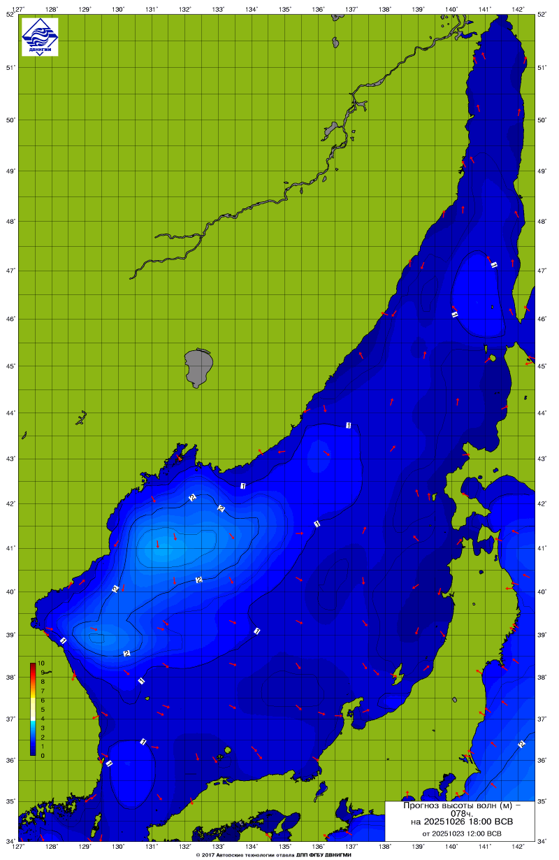 Прогноз на основе численной модели WW III является результатом научных исследований, проводящихся в ФГБУ "ДВНИГМИ".