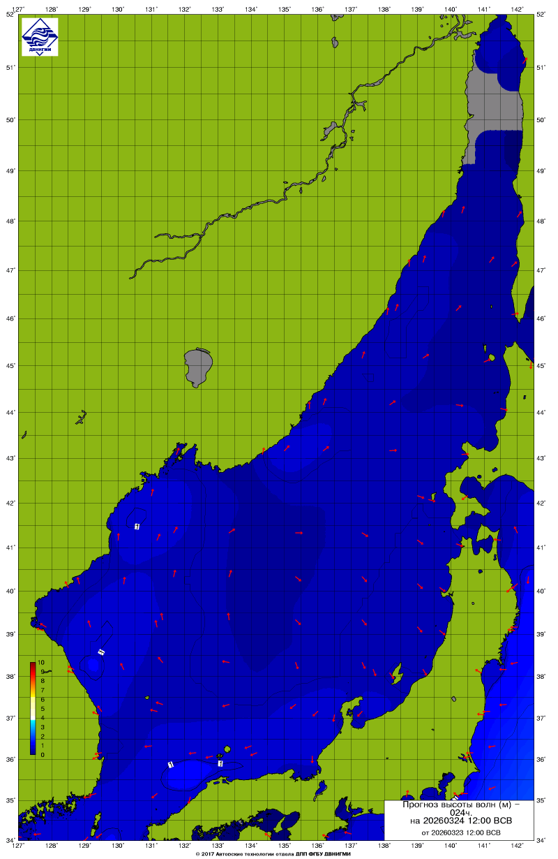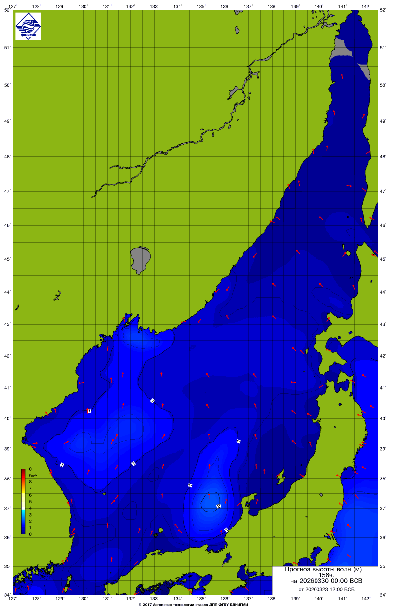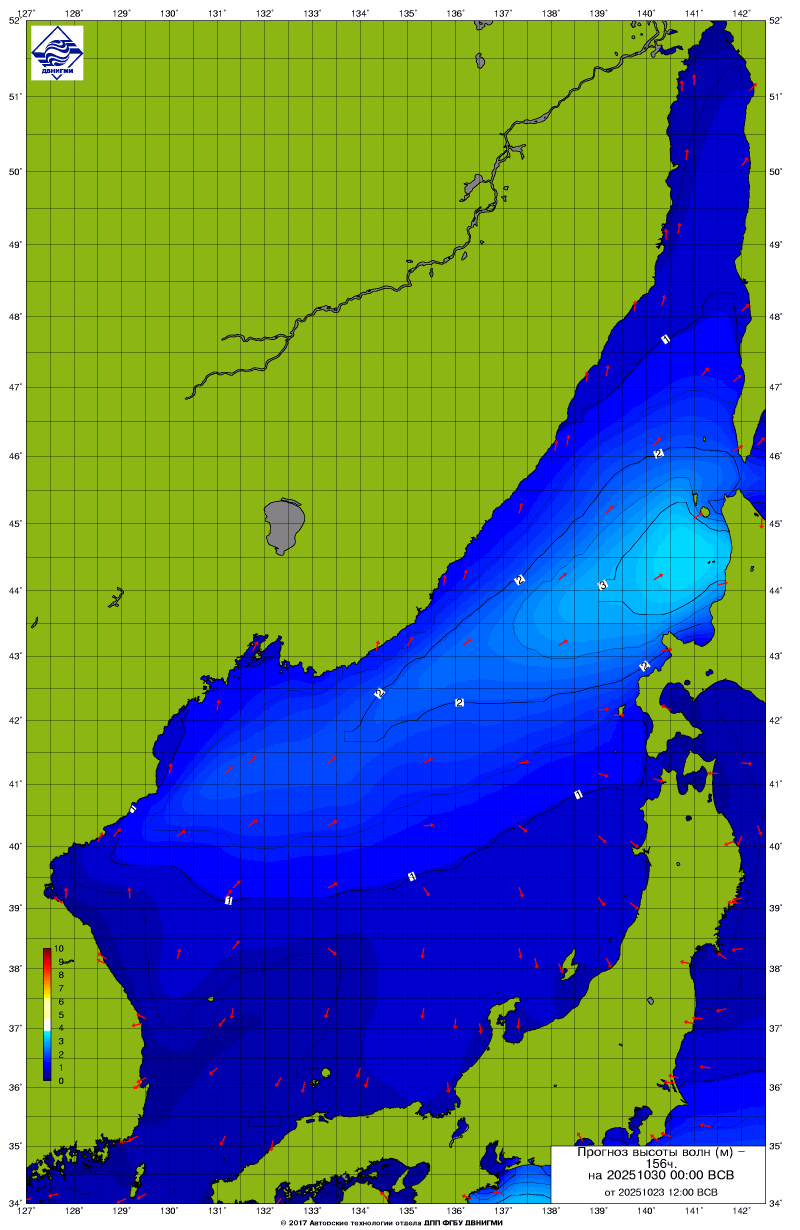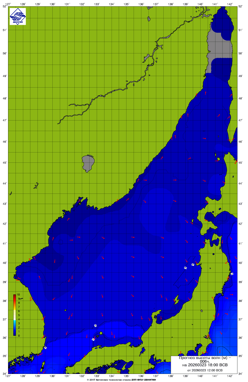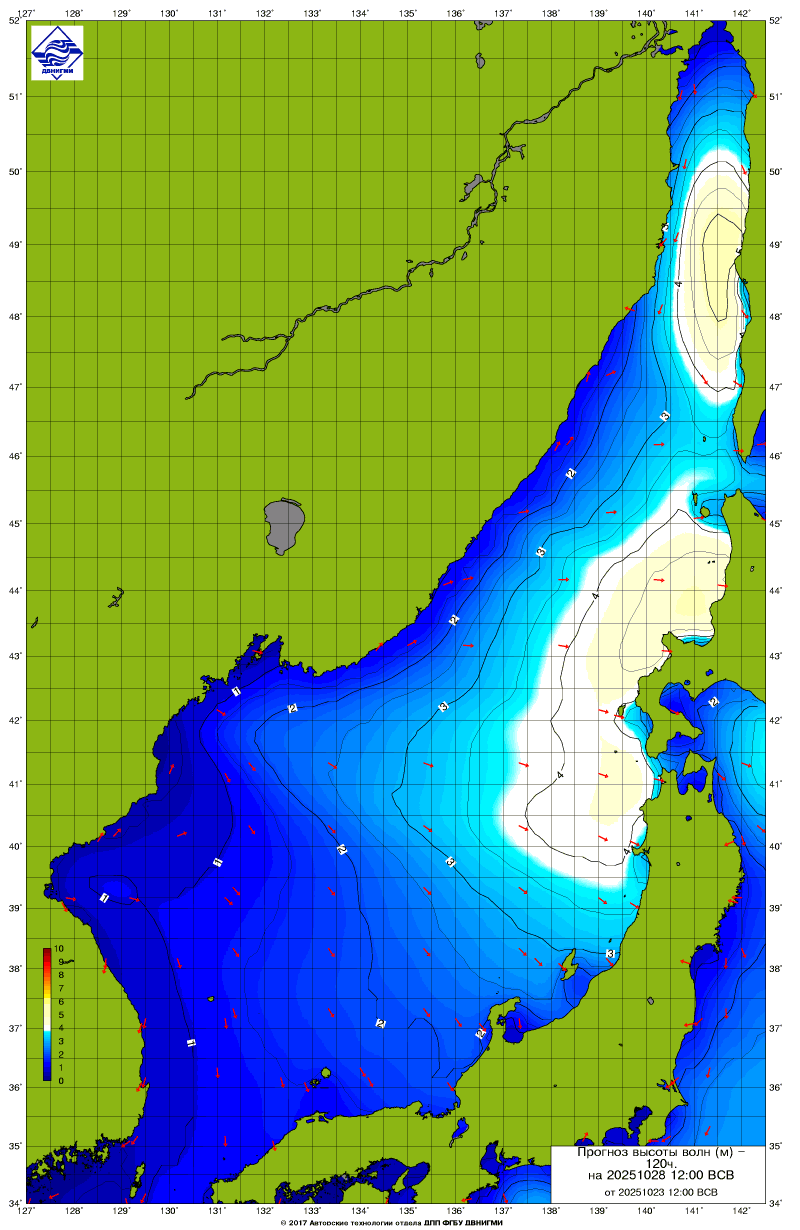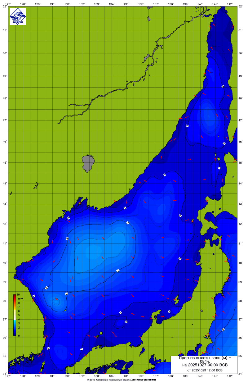 Прогноз на основе численной модели WW III является результатом научных исследований, проводящихся в ФГБУ "ДВНИГМИ".