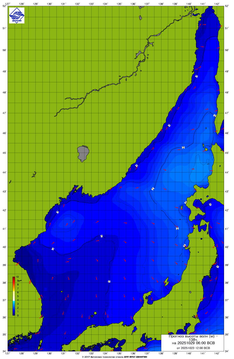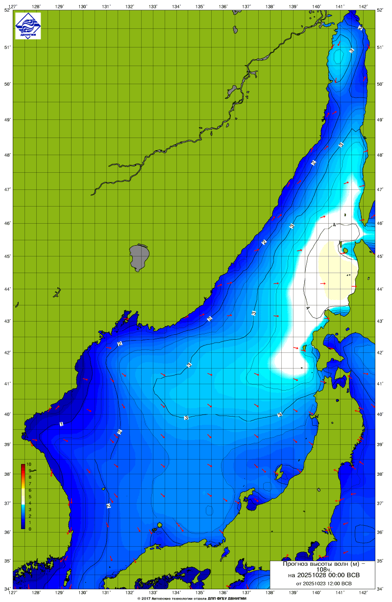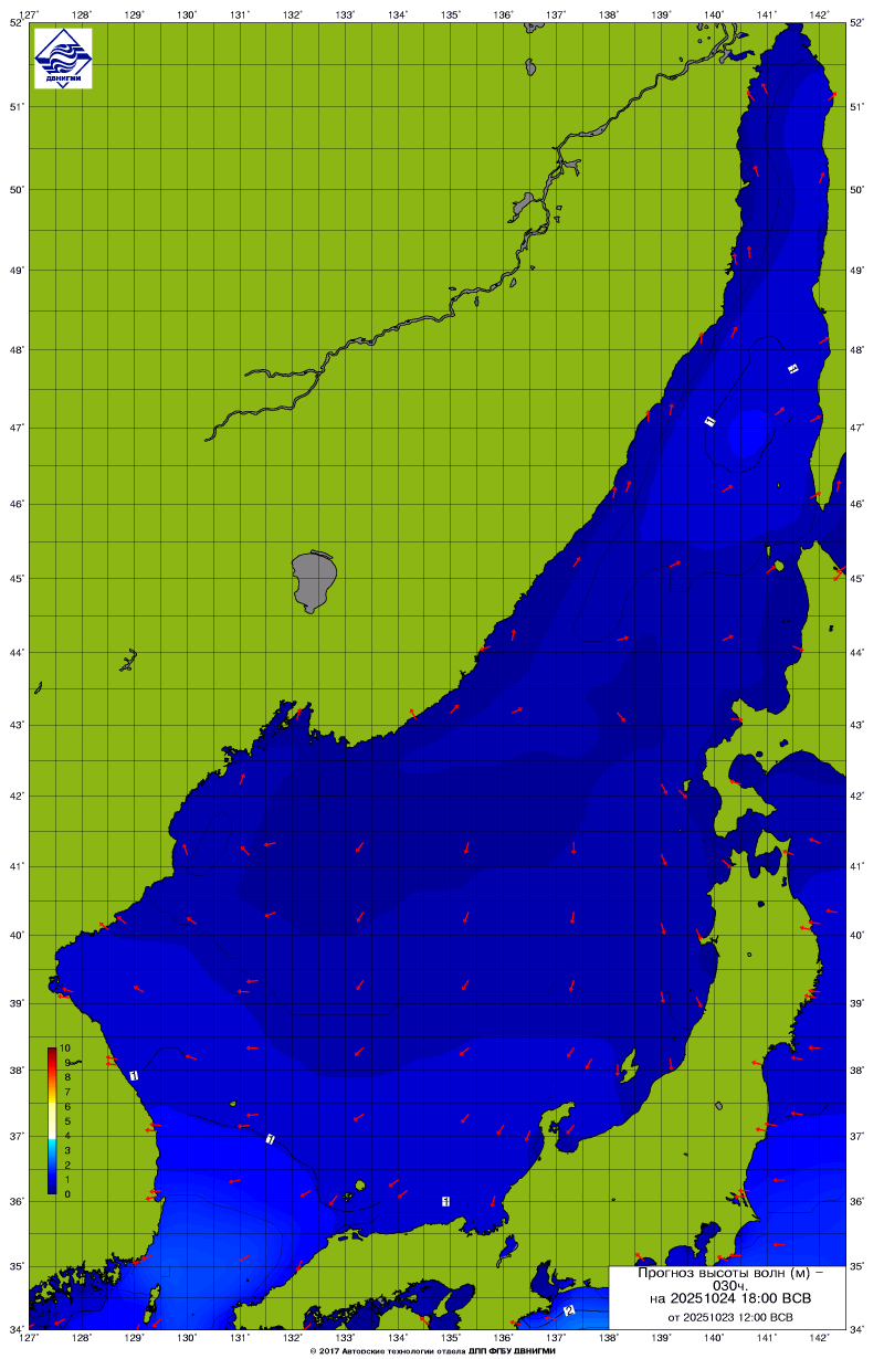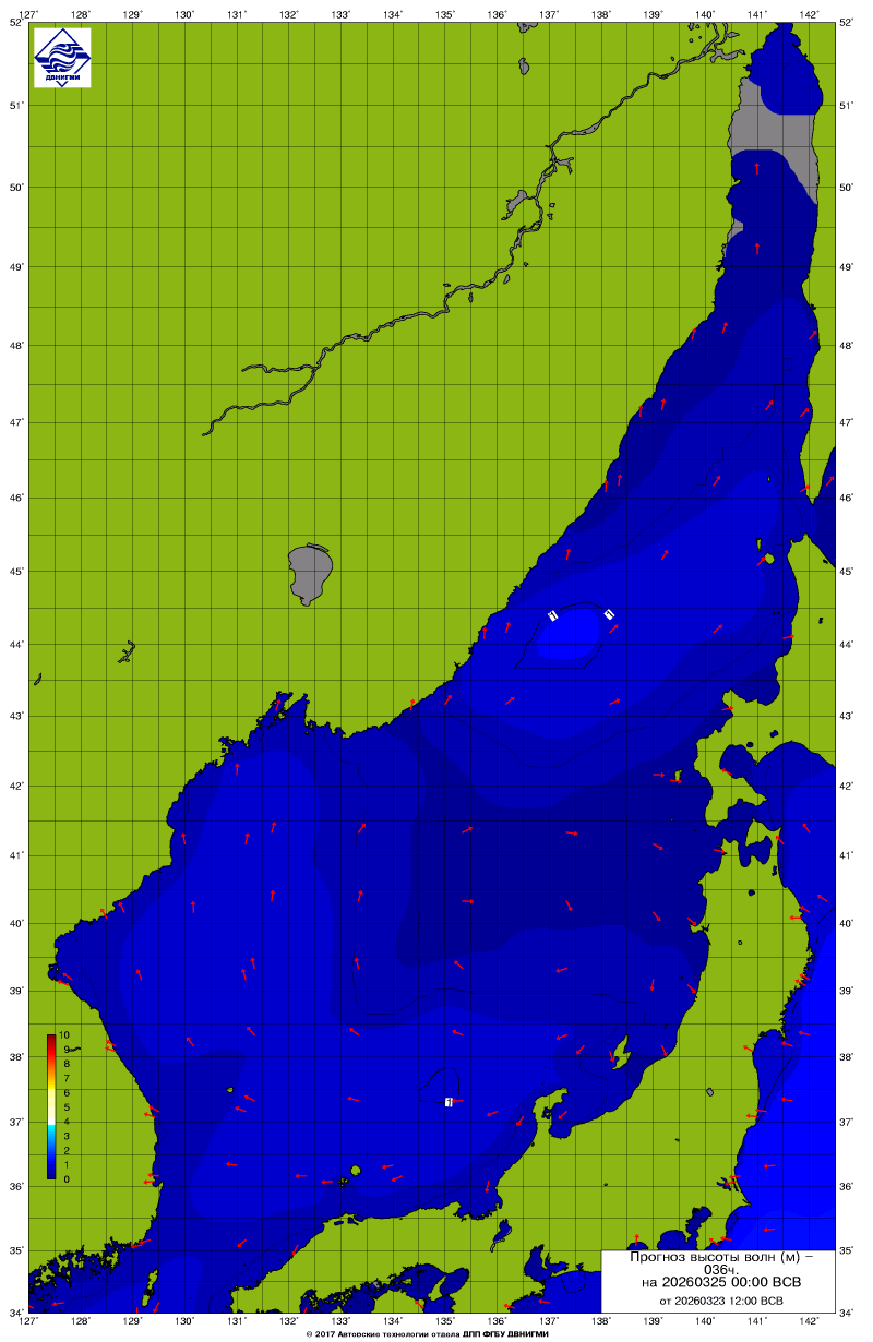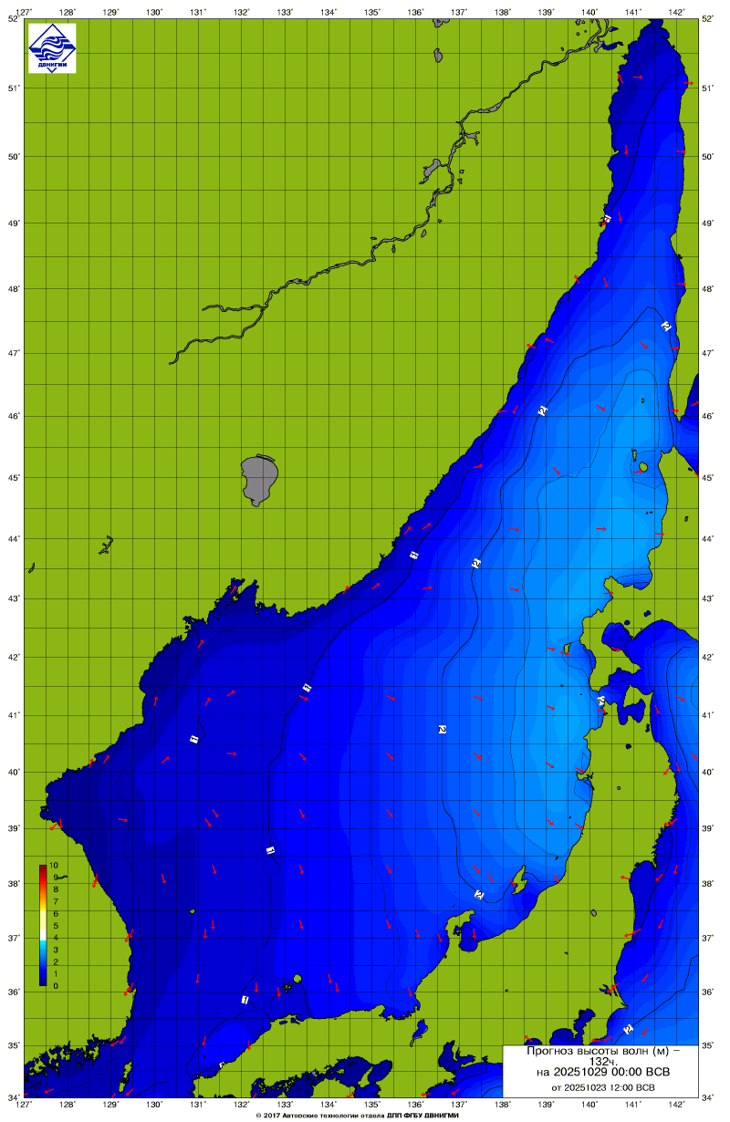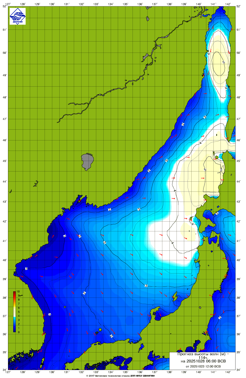 Прогноз на основе численной модели WW III является результатом научных исследований, проводящихся в ФГБУ "ДВНИГМИ".
