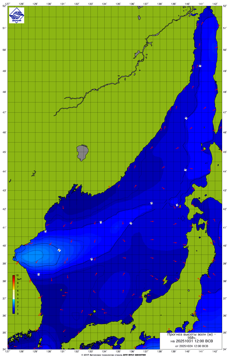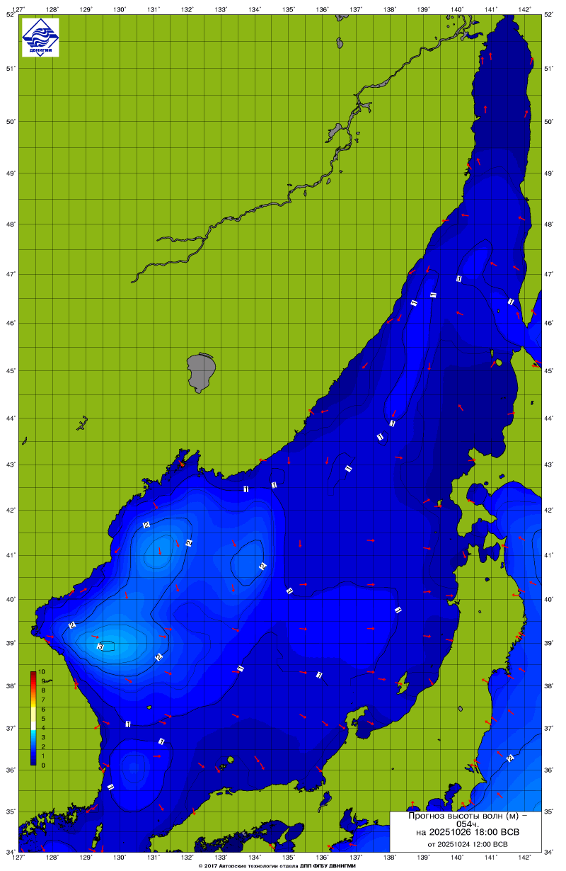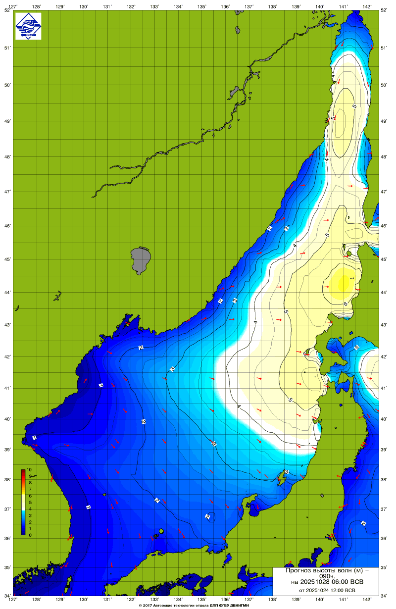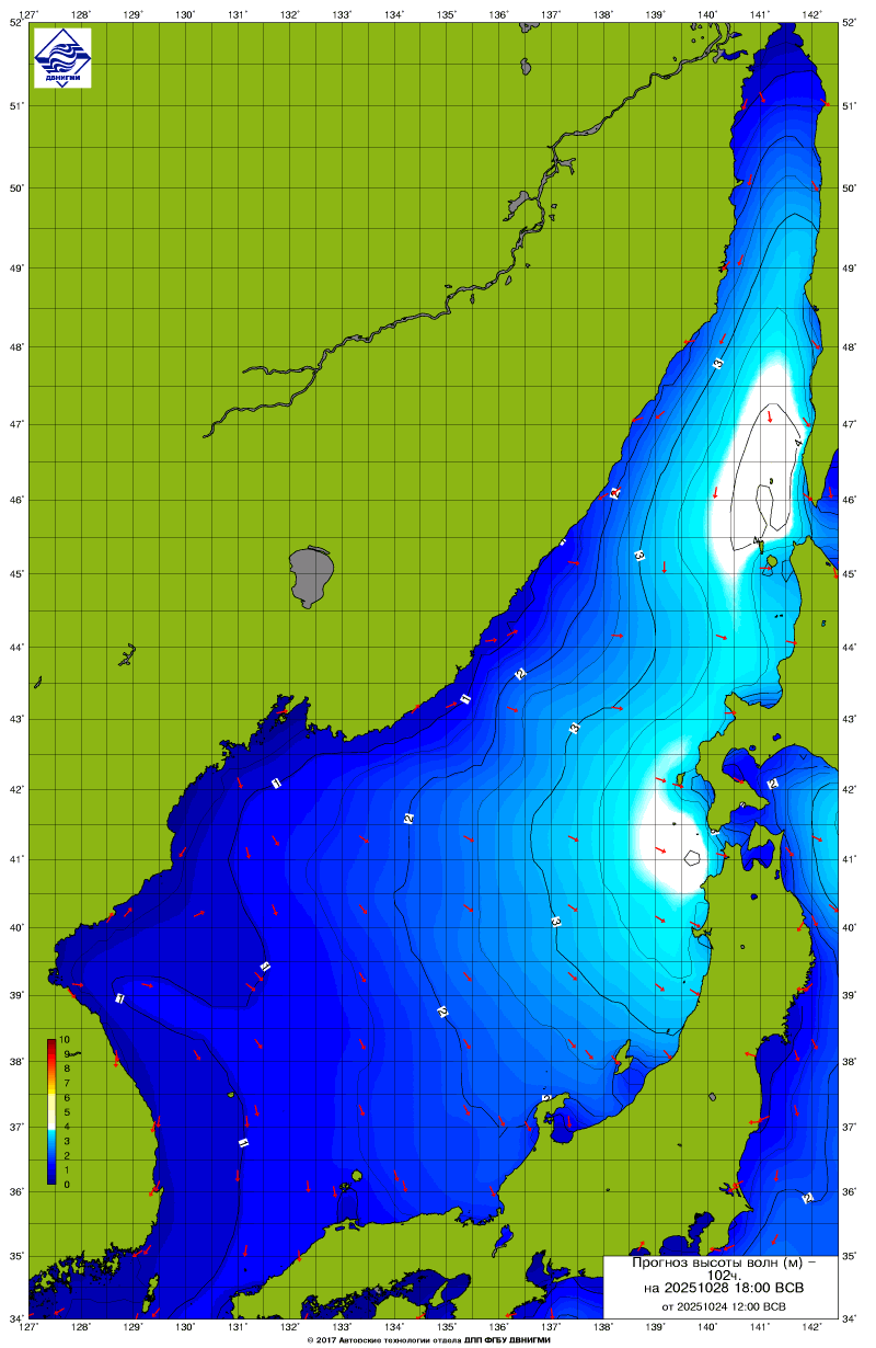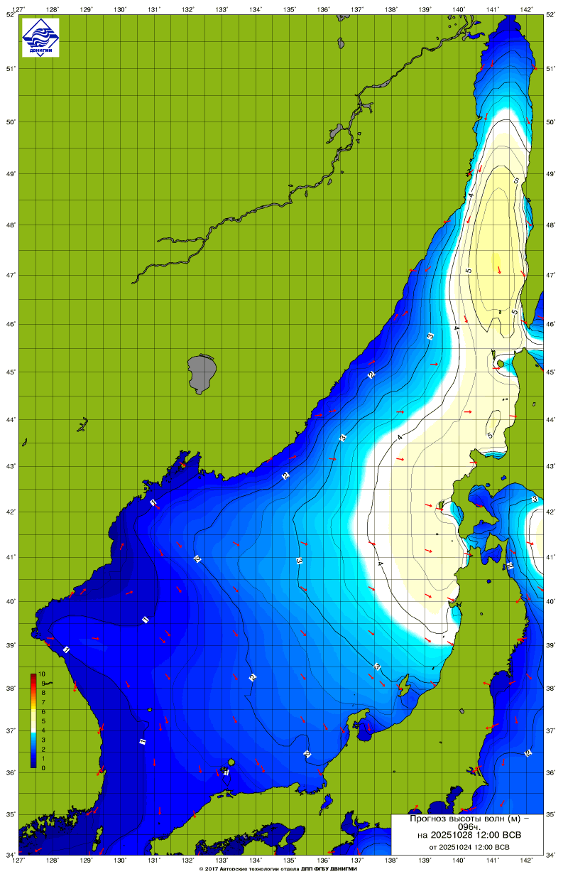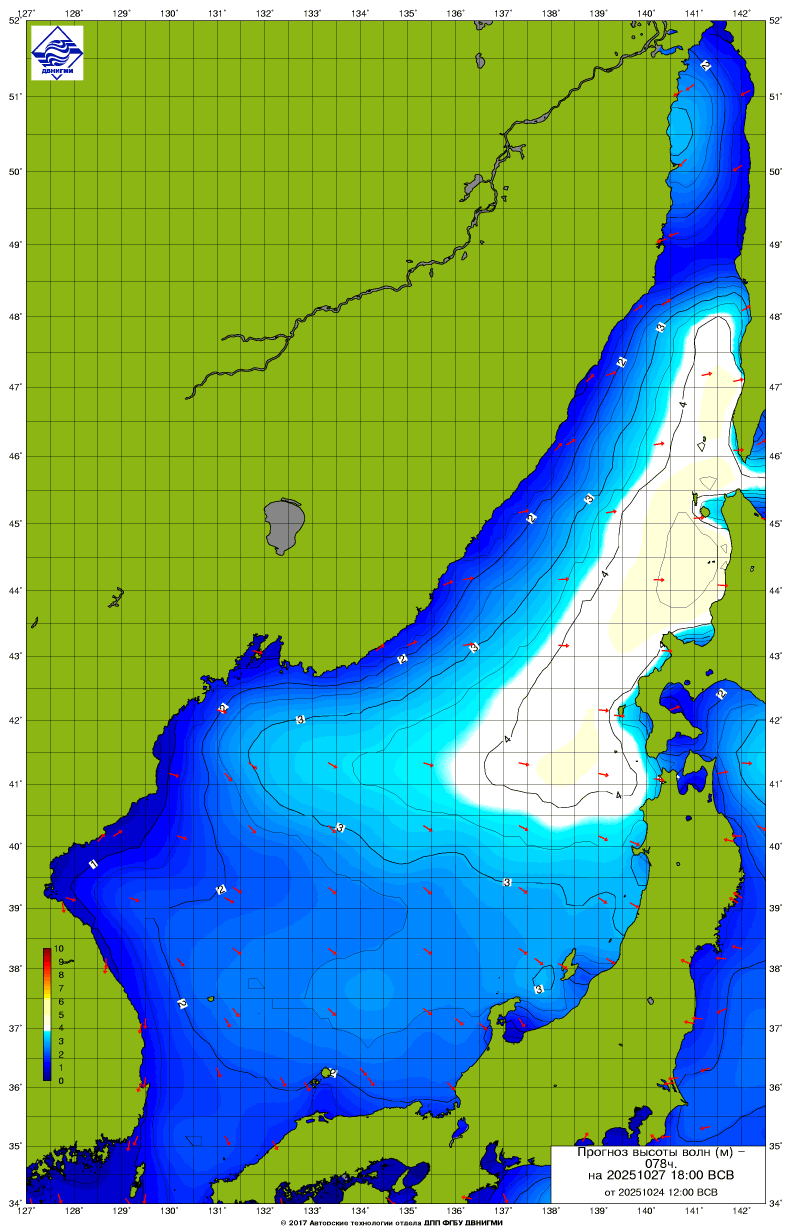 Прогноз на основе численной модели WW III является результатом научных исследований, проводящихся в ФГБУ "ДВНИГМИ".