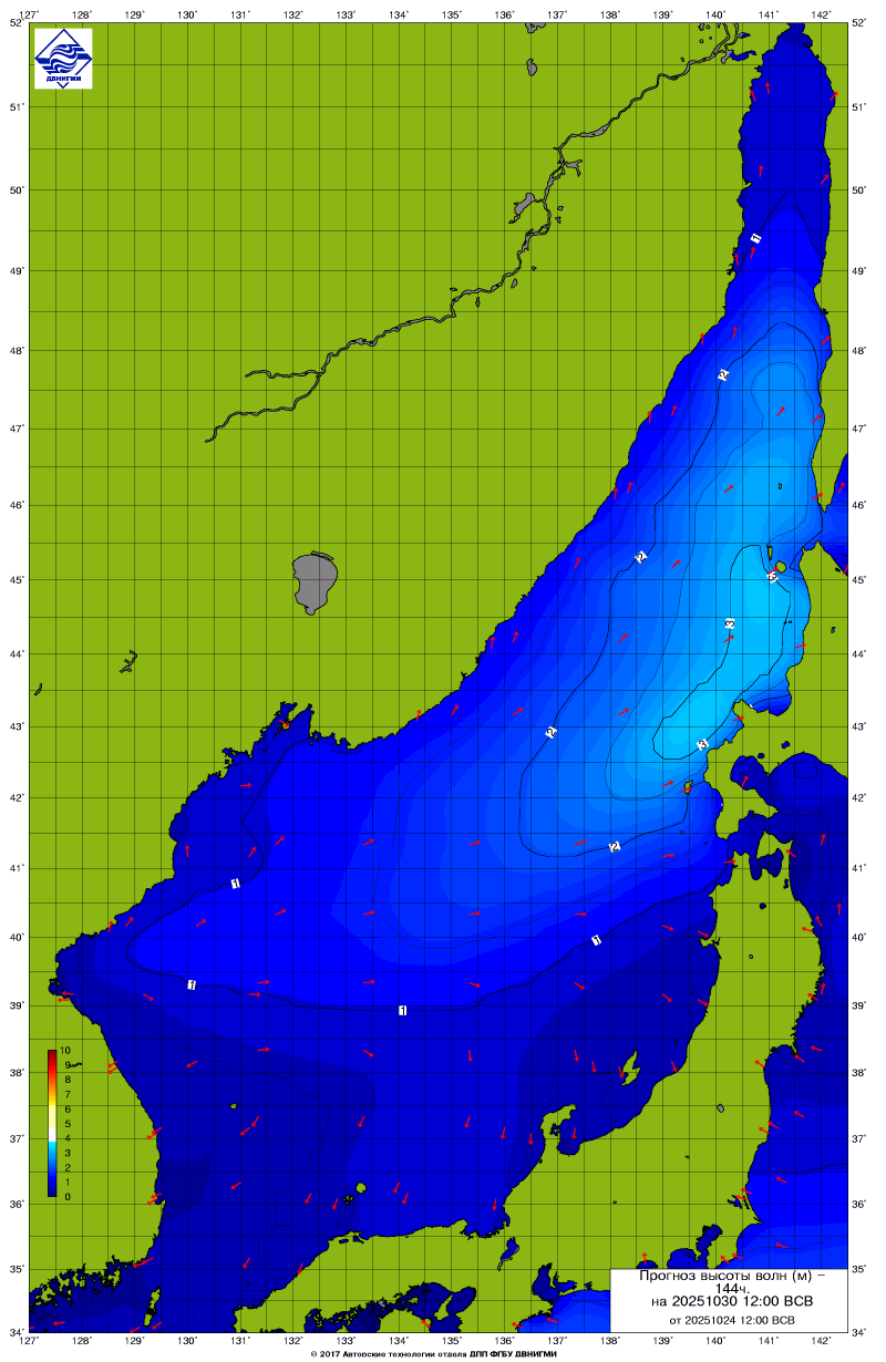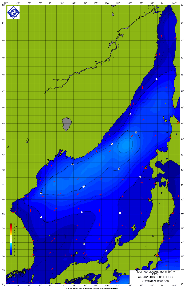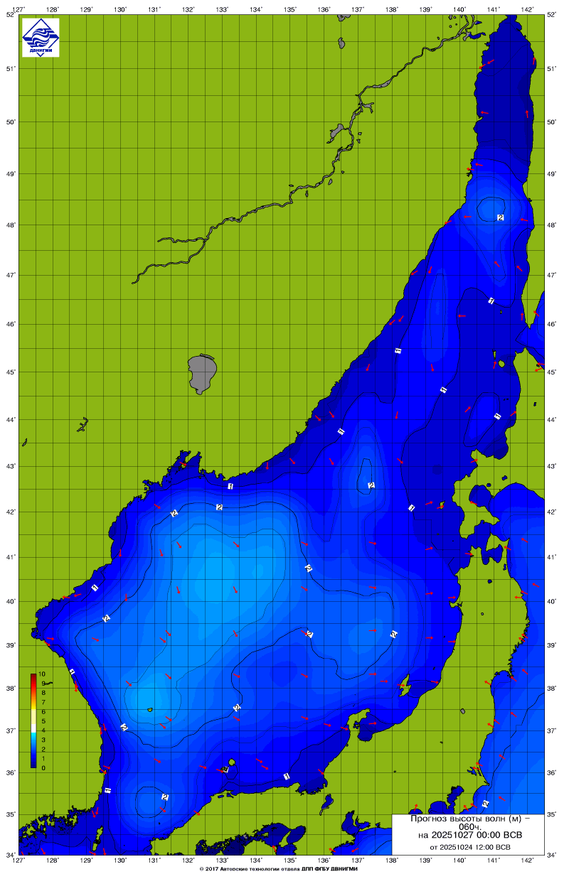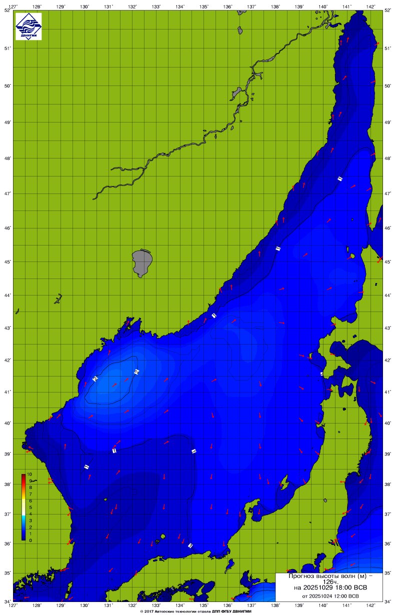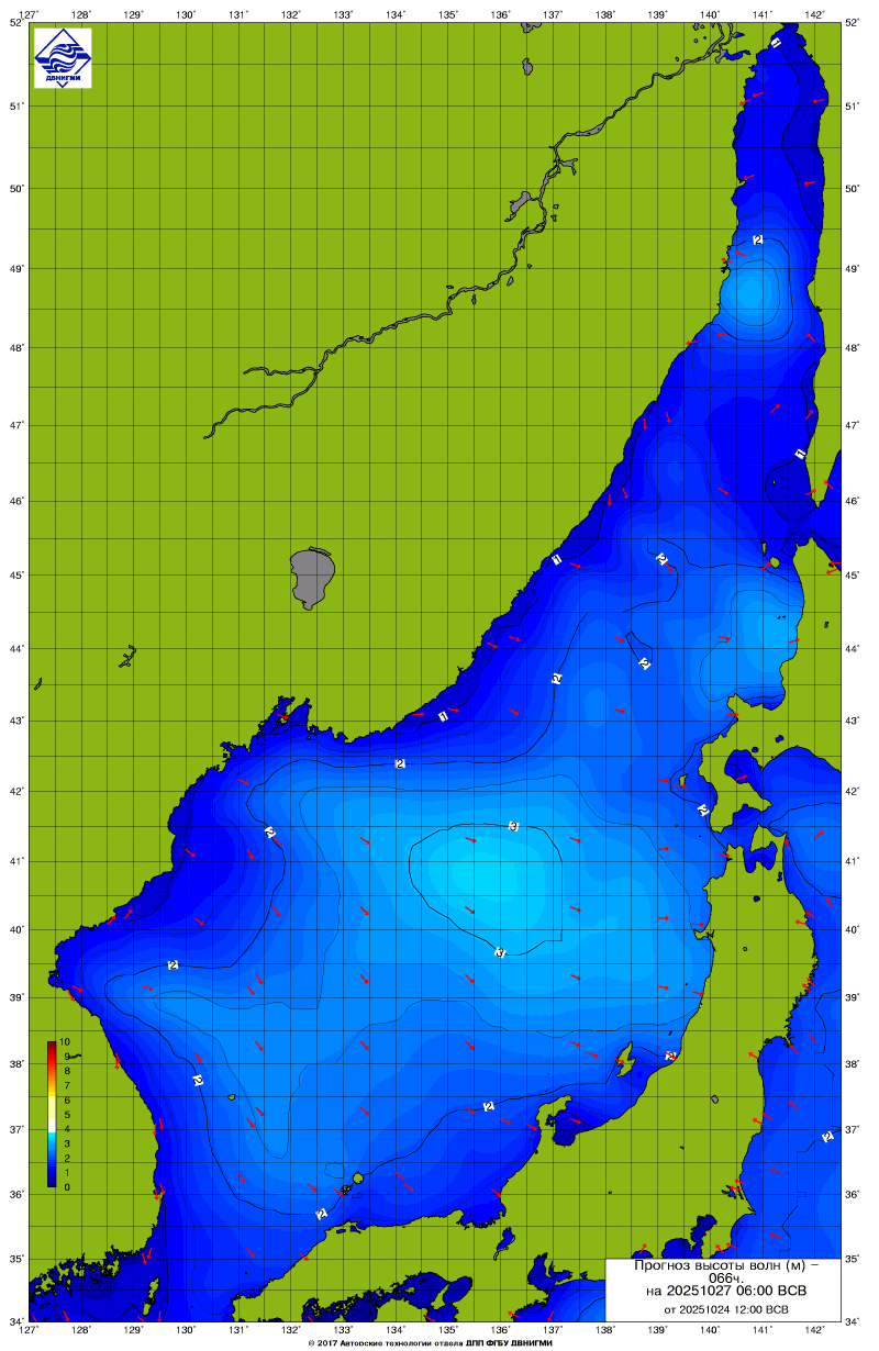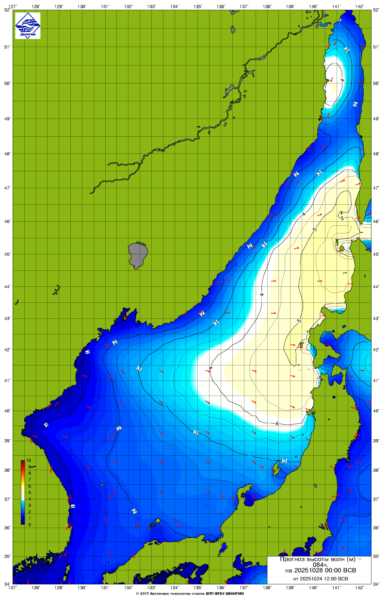 Прогноз на основе численной модели WW III является результатом научных исследований, проводящихся в ФГБУ "ДВНИГМИ".