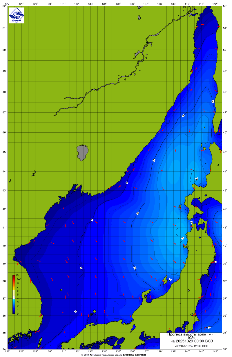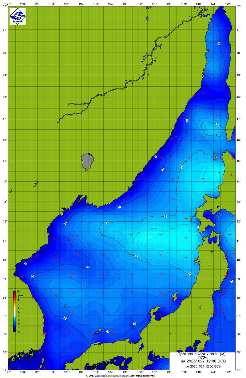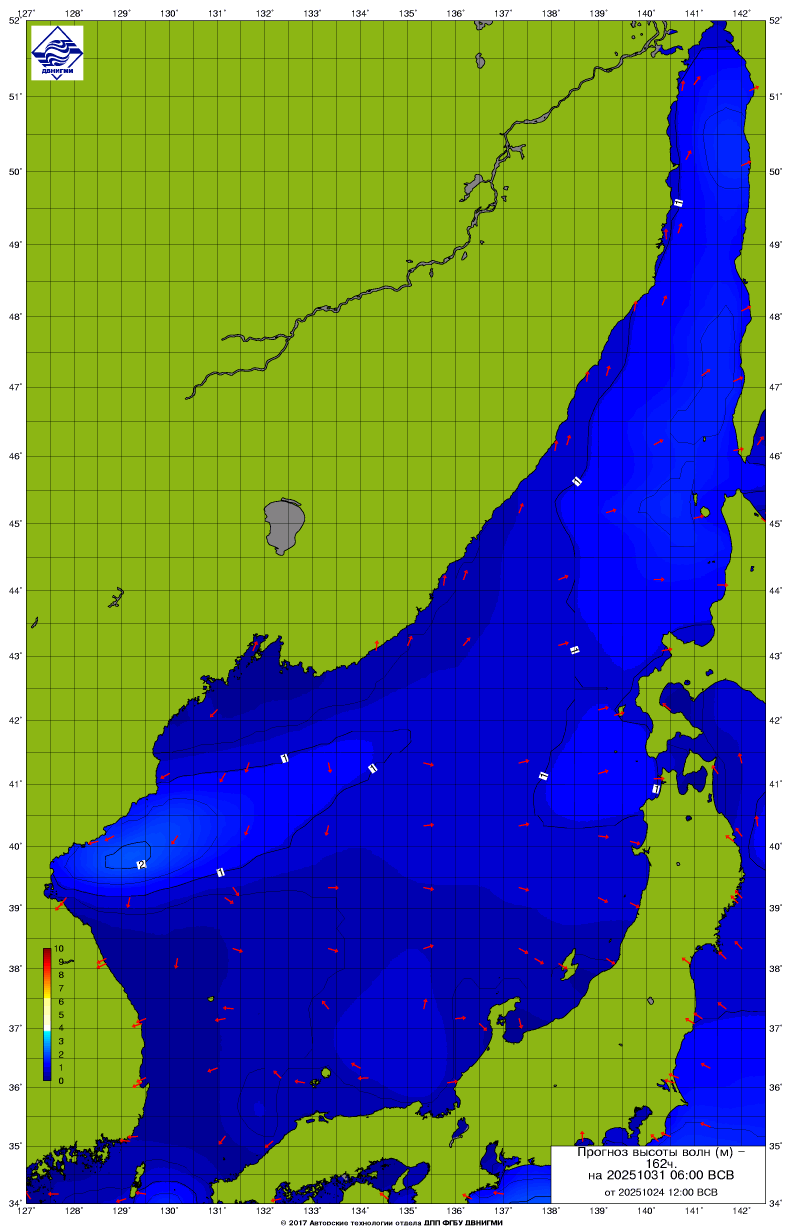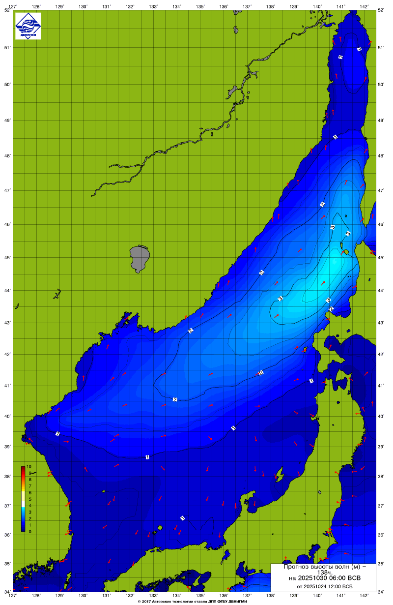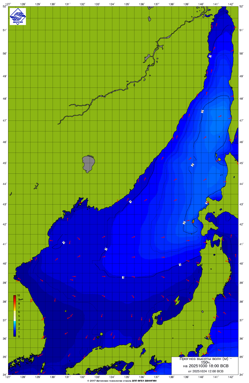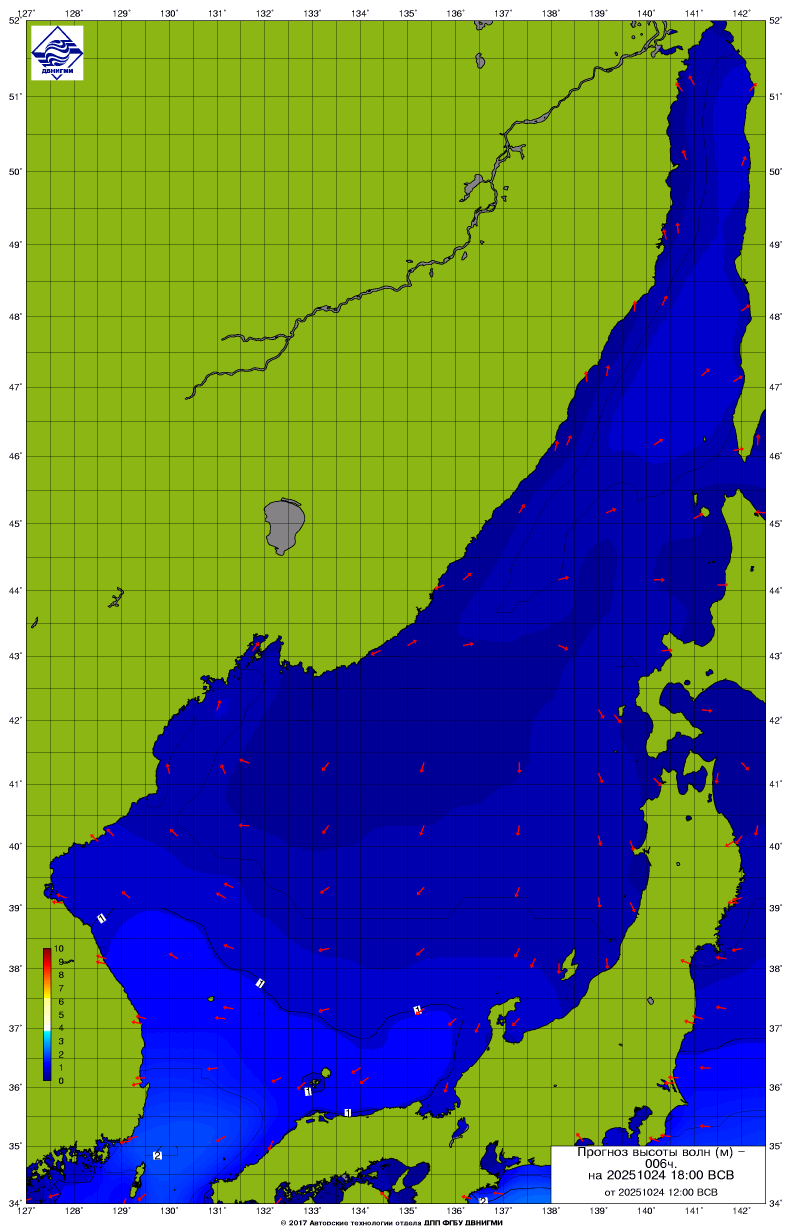 Прогноз на основе численной модели WW III является результатом научных исследований, проводящихся в ФГБУ "ДВНИГМИ".