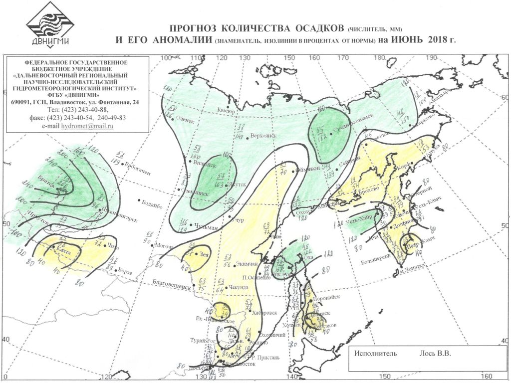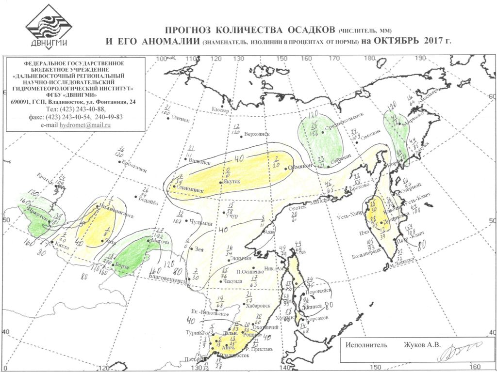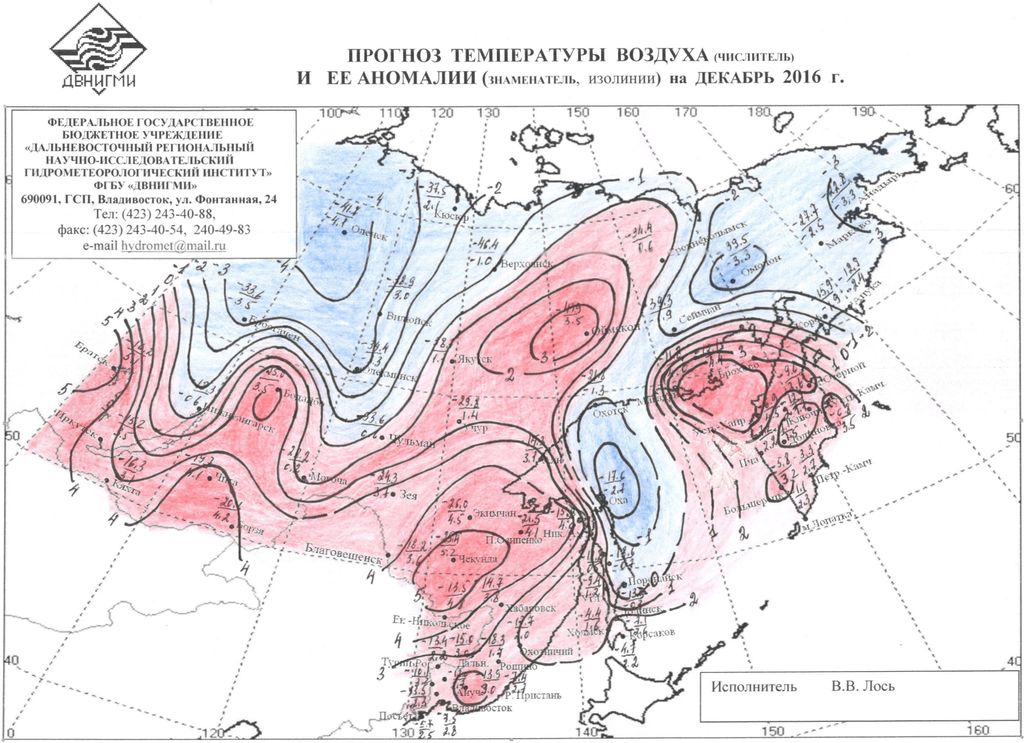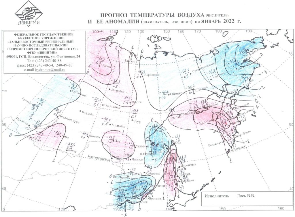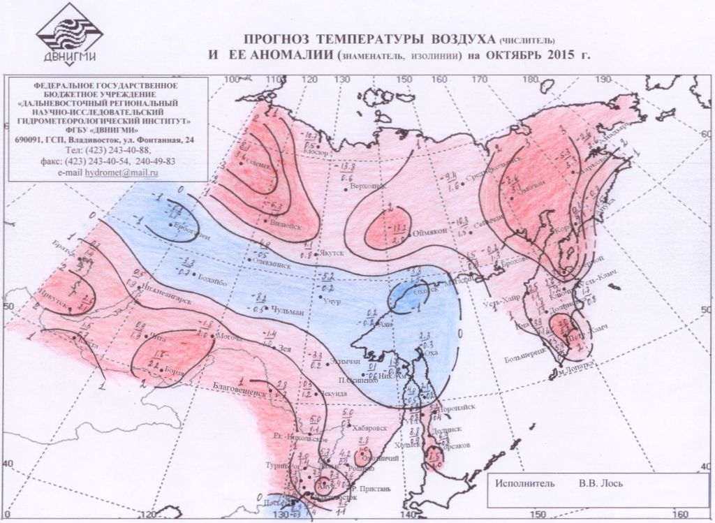 В отделе долгосрочных прогнозов погоды и изучения климата ДВНИГМИ под руководством Свинухова Г.В. был разработан метод прогноза аномалии температуры воздуха и осадков с 5 - месячной заблаговременностью для 70-ти станций Восточной Сибири и Дальнего Востока. В декабре 1973 г. данный метод был утвержден Центральной методической комиссией и рекомендован к использованию в оперативной практике в качестве консультативного. С января 1974 г. и по настоящее время прогностические карты аномалии средней месячной температуры воздуха (ΔΤ) и сумм осадков (ΔR) регулярно составляются и рассылаются для использования во все управления гидрометслужбы на территории Восточной Сибири (ВС) и Дальнего Востока (ДВ).