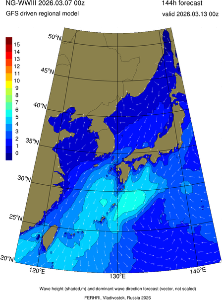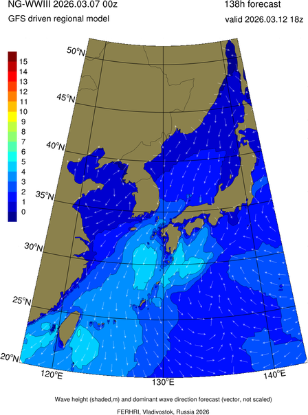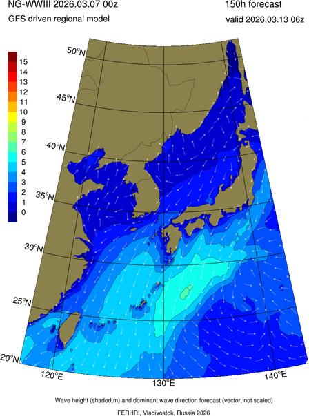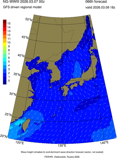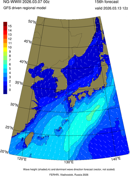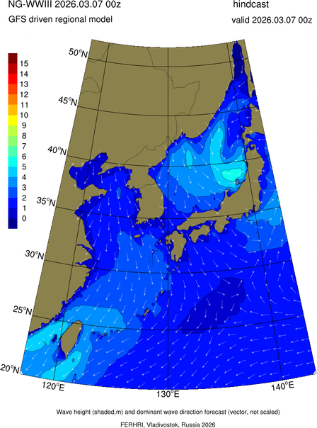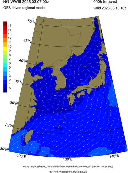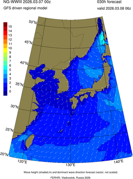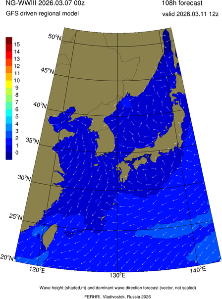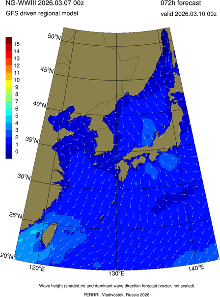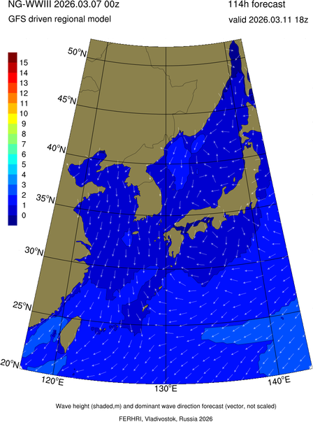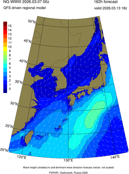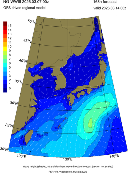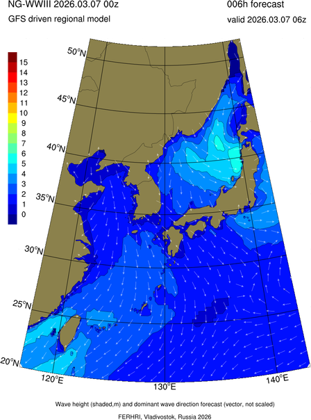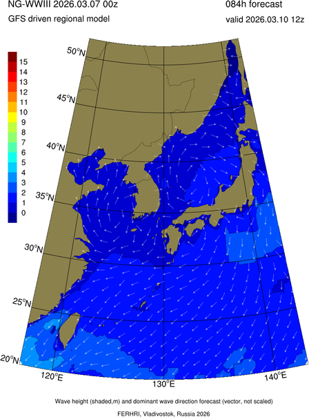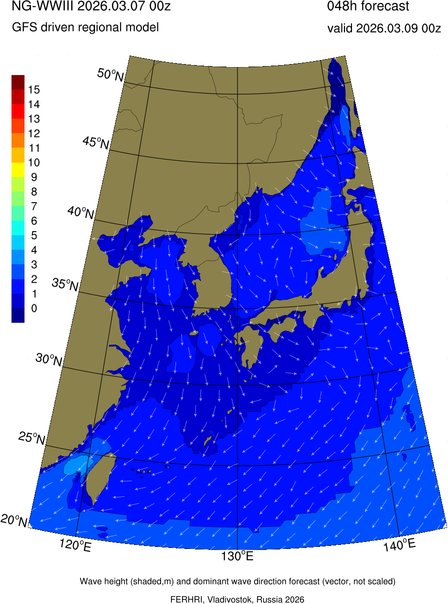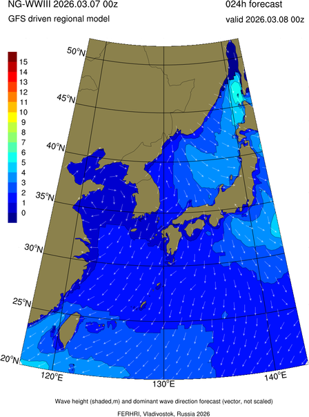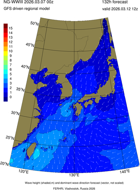 Operative products Wave height (shaded,m) and dominant wave direction forecast (Area of NEAR-GOOS) Source: FERHRI,Vladivostok, Russia Forecast method: WaveWatch III The Spherical Multiple-Cell grid: 5-10-20' Forecast lead time up to 120 hours