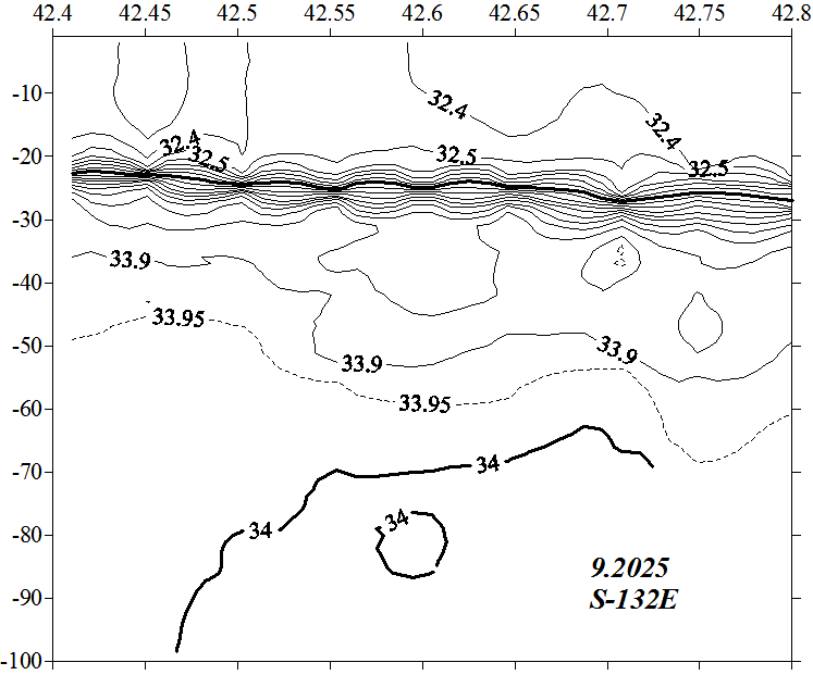 Солёность на разрезе по 132.6 в.д.
