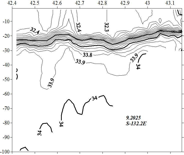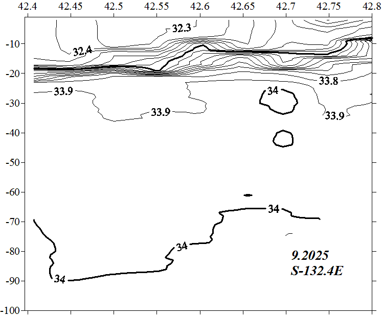 Солёность на разрезе по 132.0 в.д.