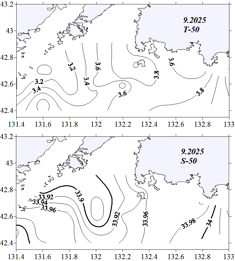 Температура и солёность на горизонте 50м