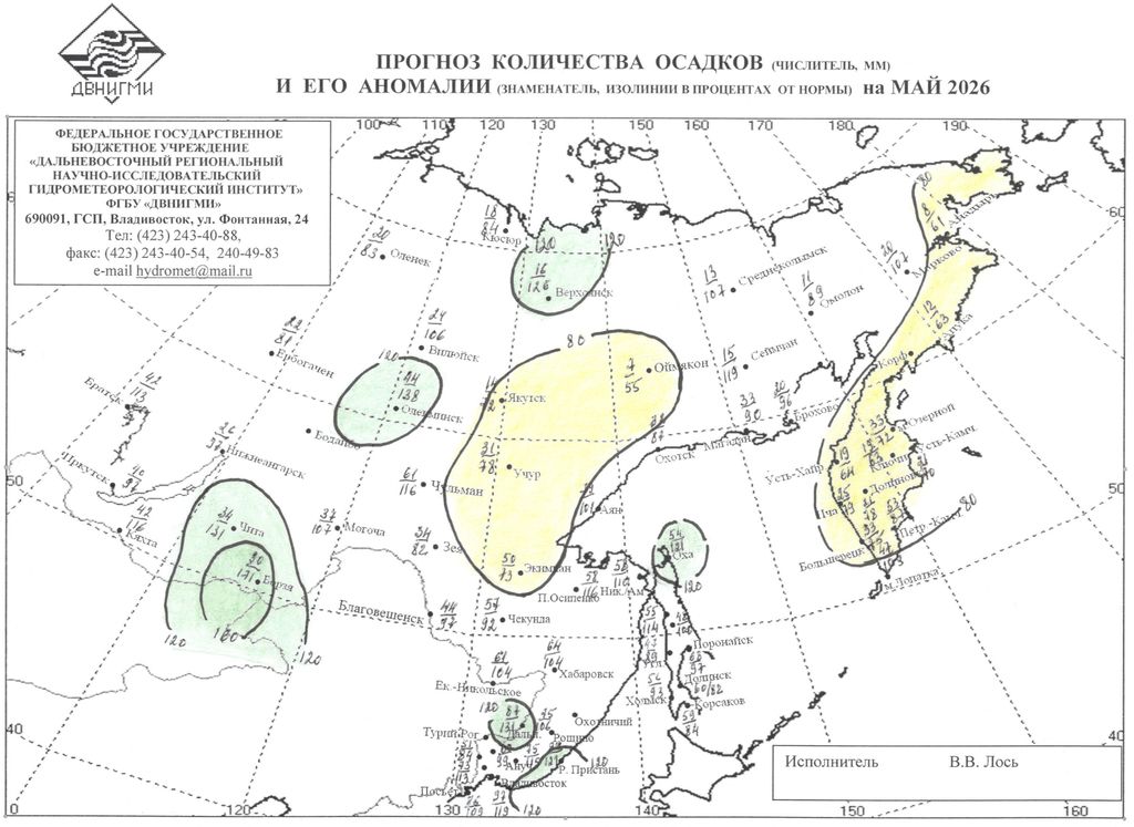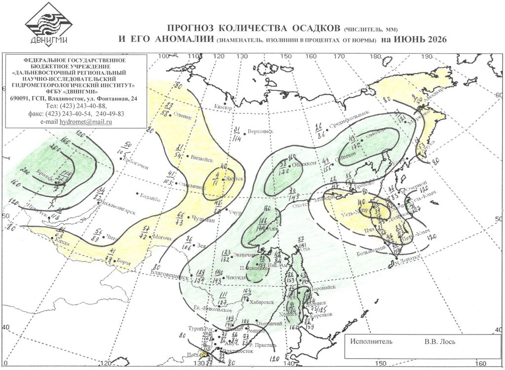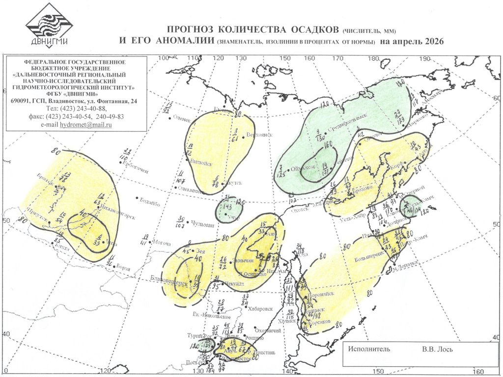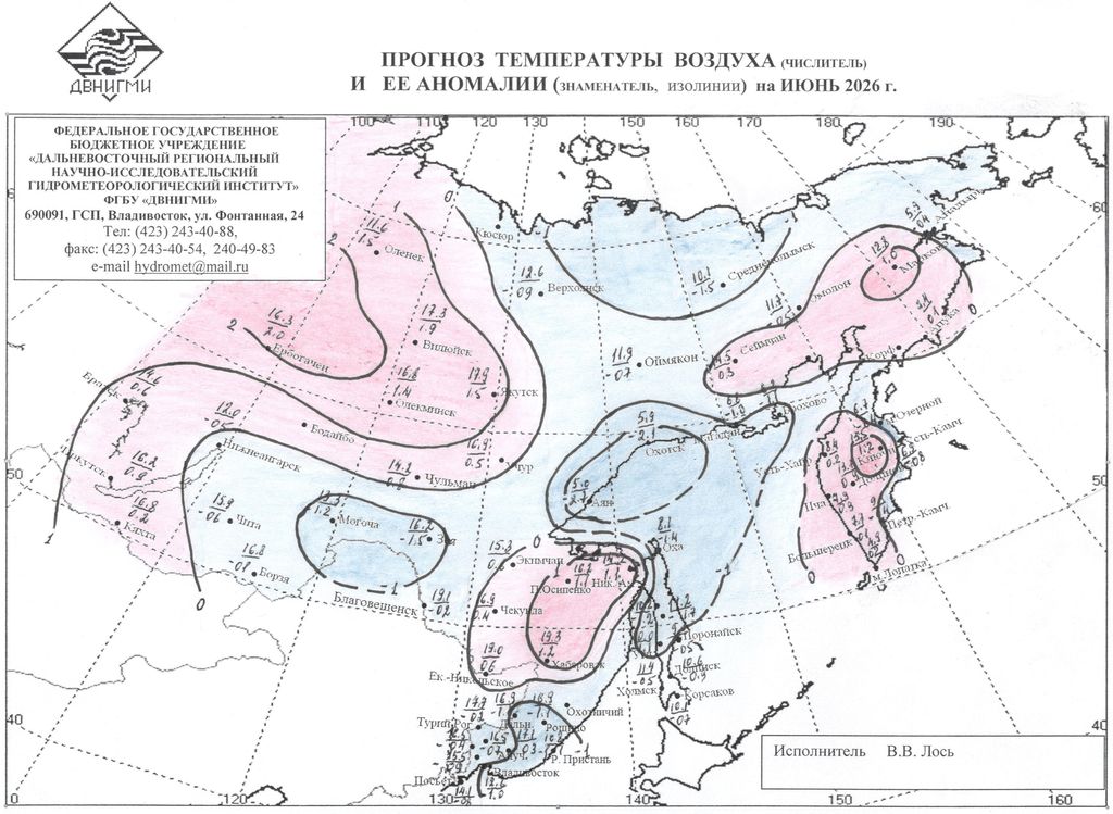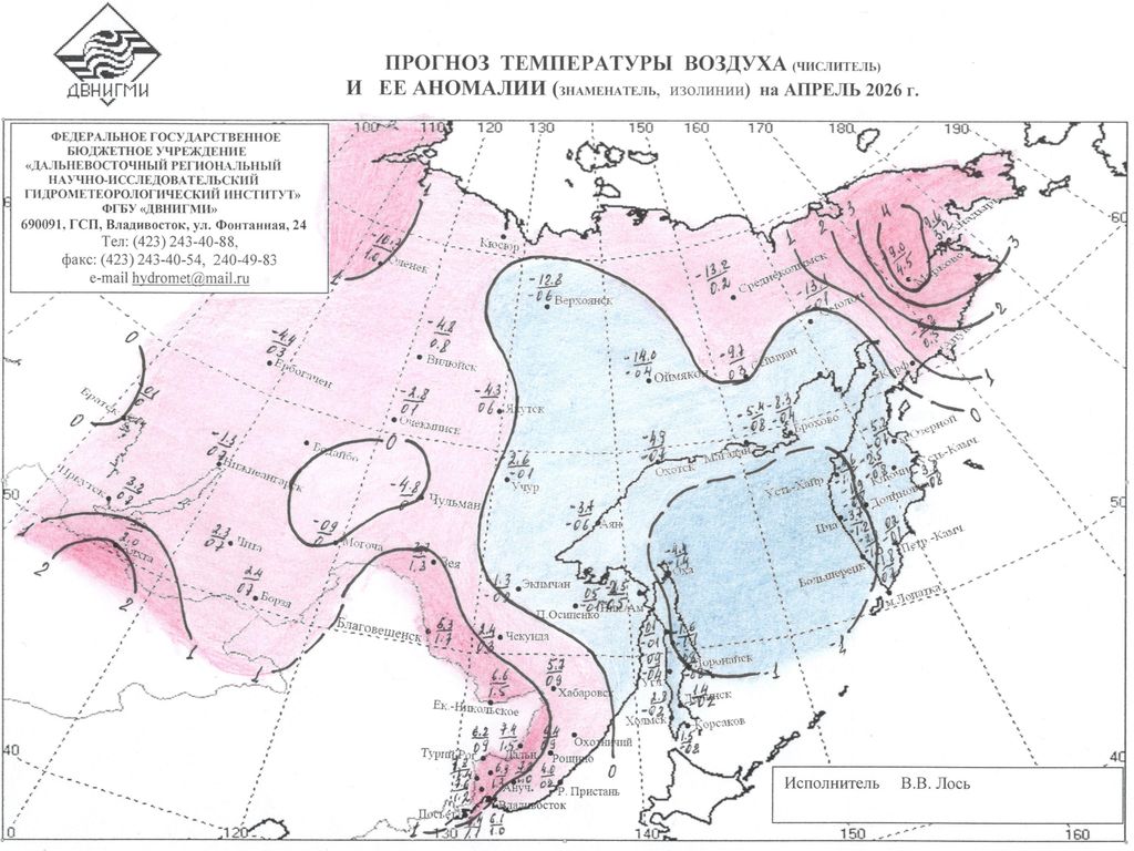 В отделе долгосрочных прогнозов погоды и изучения климата ДВНИГМИ под руководством Свинухова Г.В. был разработан метод прогноза аномалии температуры воздуха и осадков с 5 - месячной заблаговременностью для 70-ти станций Восточной Сибири и Дальнего Востока. В декабре 1973 г. данный метод был утвержден Центральной методической комиссией и рекомендован к использованию в оперативной практике в качестве консультативного. С января 1974 г. и по настоящее время прогностические карты аномалии средней месячной температуры воздуха (ΔΤ) и сумм осадков (ΔR) регулярно составляются и рассылаются для использования во все управления гидрометслужбы на территории Восточной Сибири (ВС) и Дальнего Востока (ДВ).
