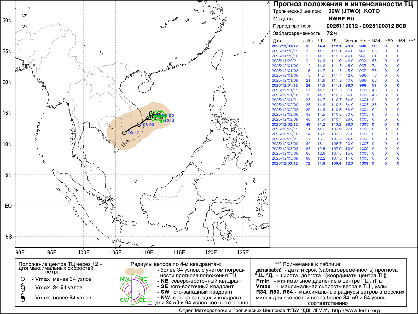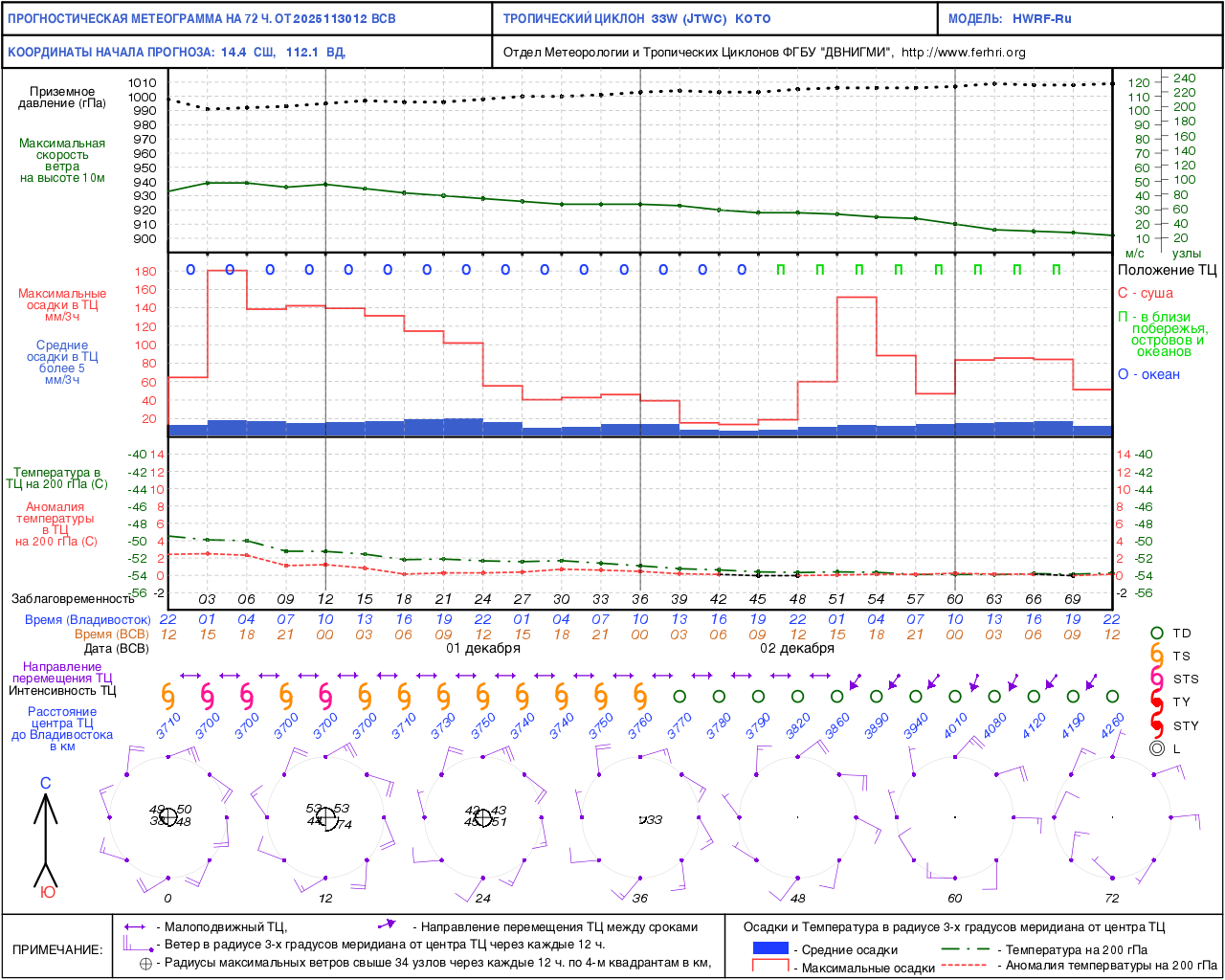 Данная продукция представлена численными прогнозами положения и интенсивности тайфунов по модели WRF. Согласно решению ЦМКП Росгидромета от 20 июня 2017 г. автоматизированный метод краткосрочного (с заблаговременностью до 72 часов) прогноза положения тропических циклонов рекомендован в качестве основного - для практического применения в оперативно-прогностической работе дальневосточных территориальных управлений Росгидромета. Прогноз интенсивности тропических циклонов имеет статус консультативного.