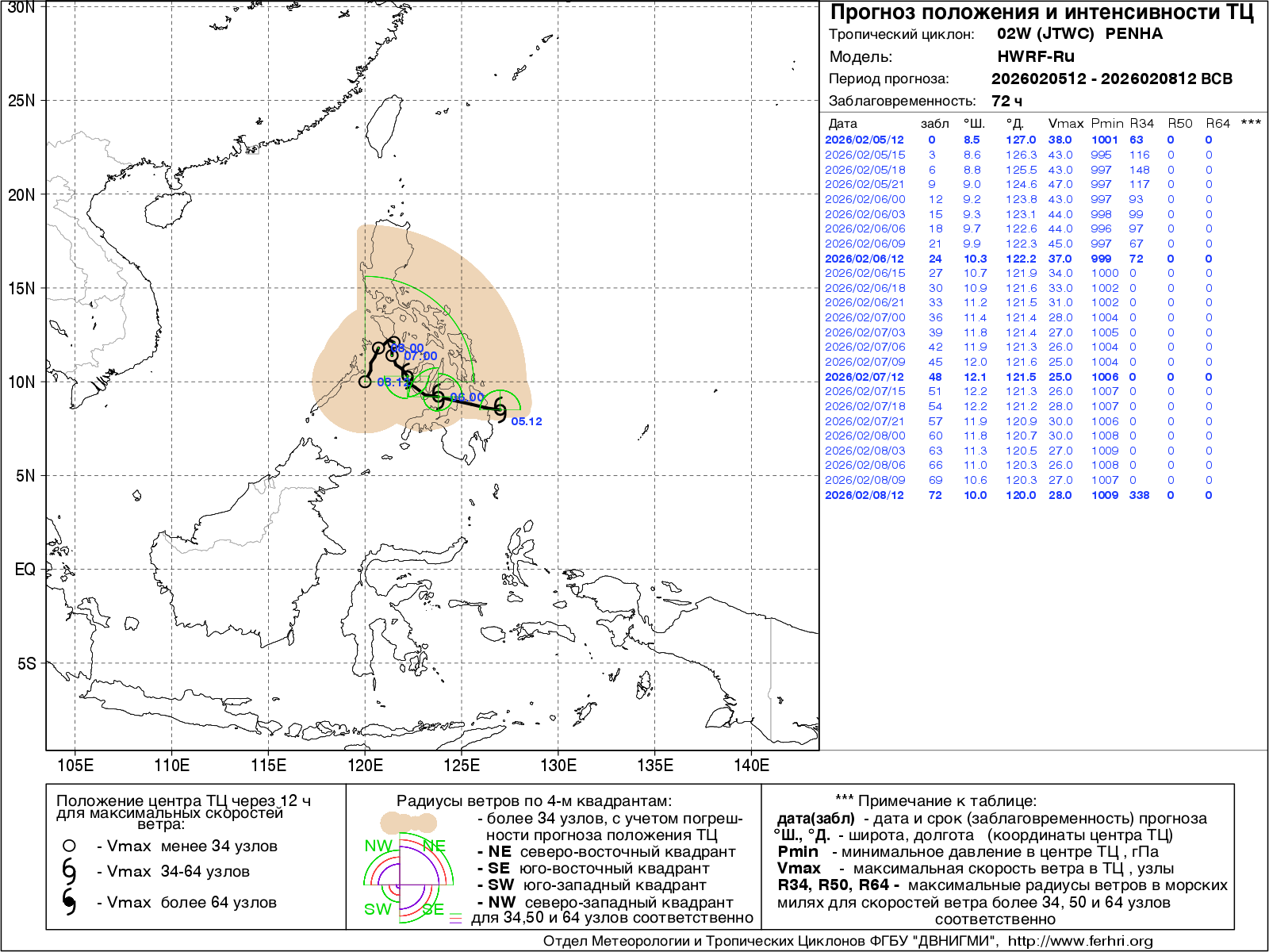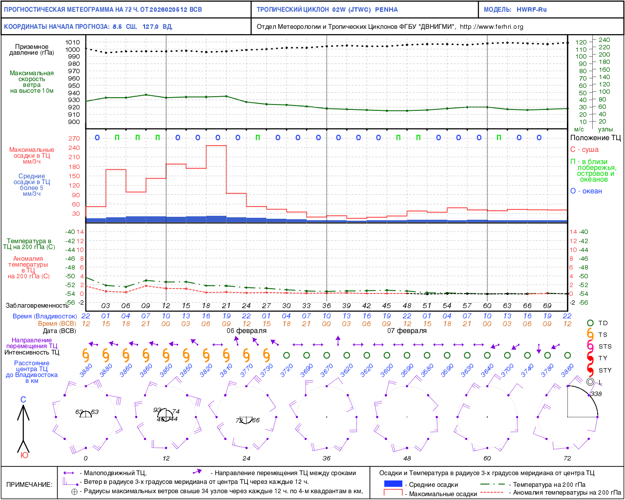 Данная продукция представлена численными прогнозами положения и интенсивности тайфунов по модели WRF. Согласно решению ЦМКП Росгидромета от 20 июня 2017 г. автоматизированный метод краткосрочного (с заблаговременностью до 72 часов) прогноза положения тропических циклонов рекомендован в качестве основного - для практического применения в оперативно-прогностической работе дальневосточных территориальных управлений Росгидромета. Прогноз интенсивности тропических циклонов имеет статус консультативного.