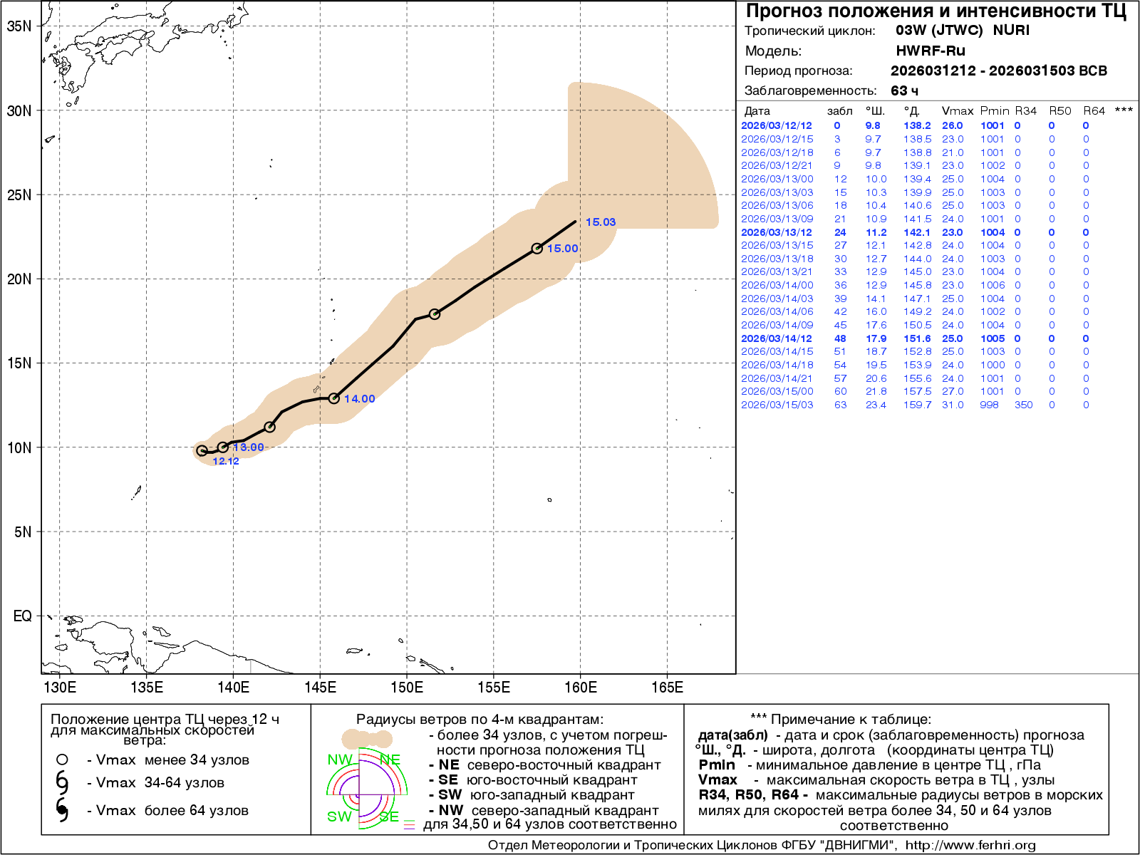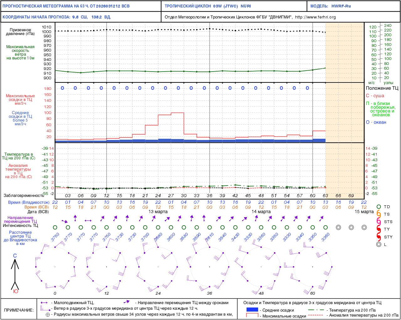 Данная продукция представлена численными прогнозами положения и интенсивности тайфунов по модели WRF. Согласно решению ЦМКП Росгидромета от 20 июня 2017 г. автоматизированный метод краткосрочного (с заблаговременностью до 72 часов) прогноза положения тропических циклонов рекомендован в качестве основного - для практического применения в оперативно-прогностической работе дальневосточных территориальных управлений Росгидромета. Прогноз интенсивности тропических циклонов имеет статус консультативного.