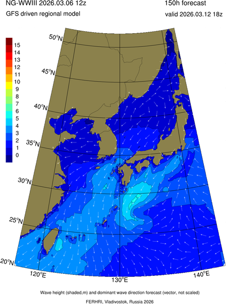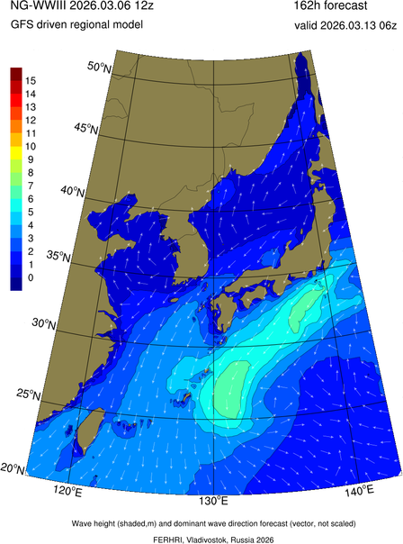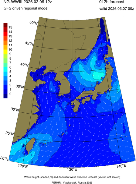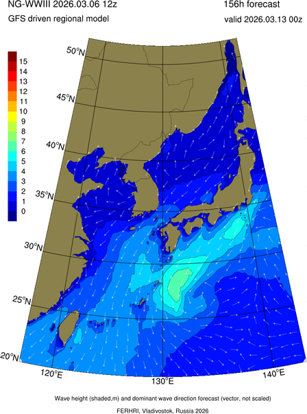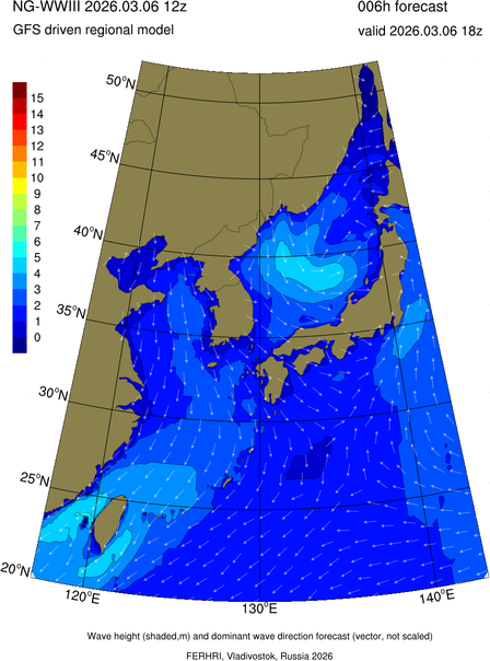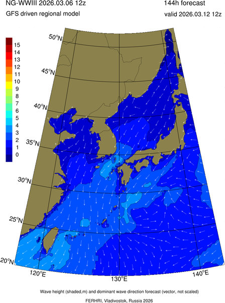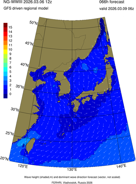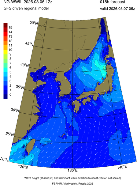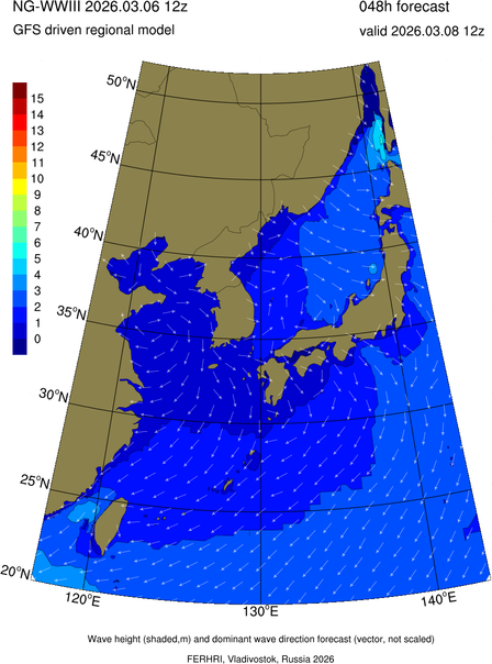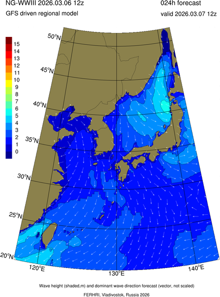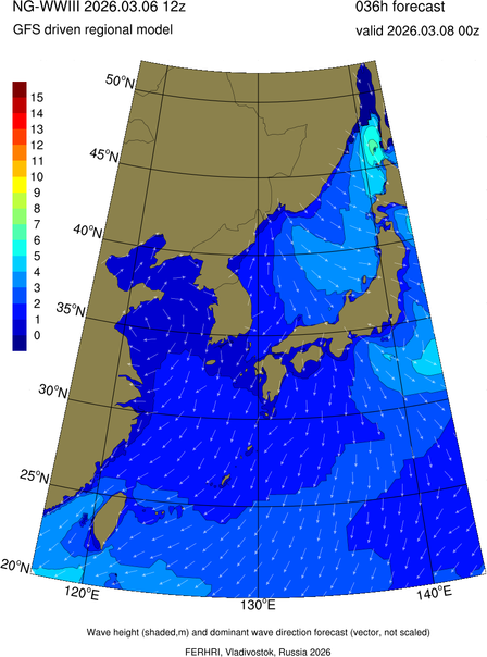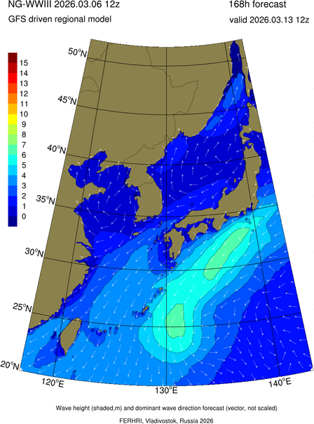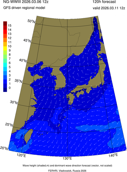 Operative products Wave height (shaded,m) and dominant wave direction forecast (Area of NEAR-GOOS) Source: FERHRI,Vladivostok, Russia Forecast method: WaveWatch III The Spherical Multiple-Cell grid: 5-10-20' Forecast lead time up to 120 hours