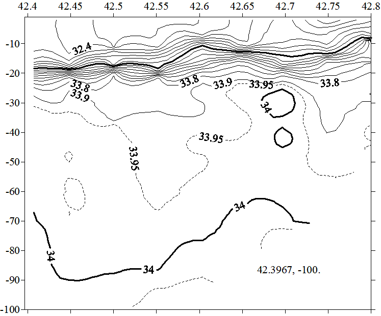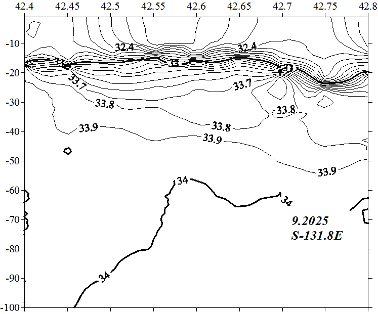 Солёность на разрезе по 131.8 в.д.