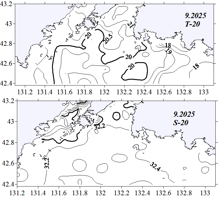 Температура и солёность на горизонте 20м