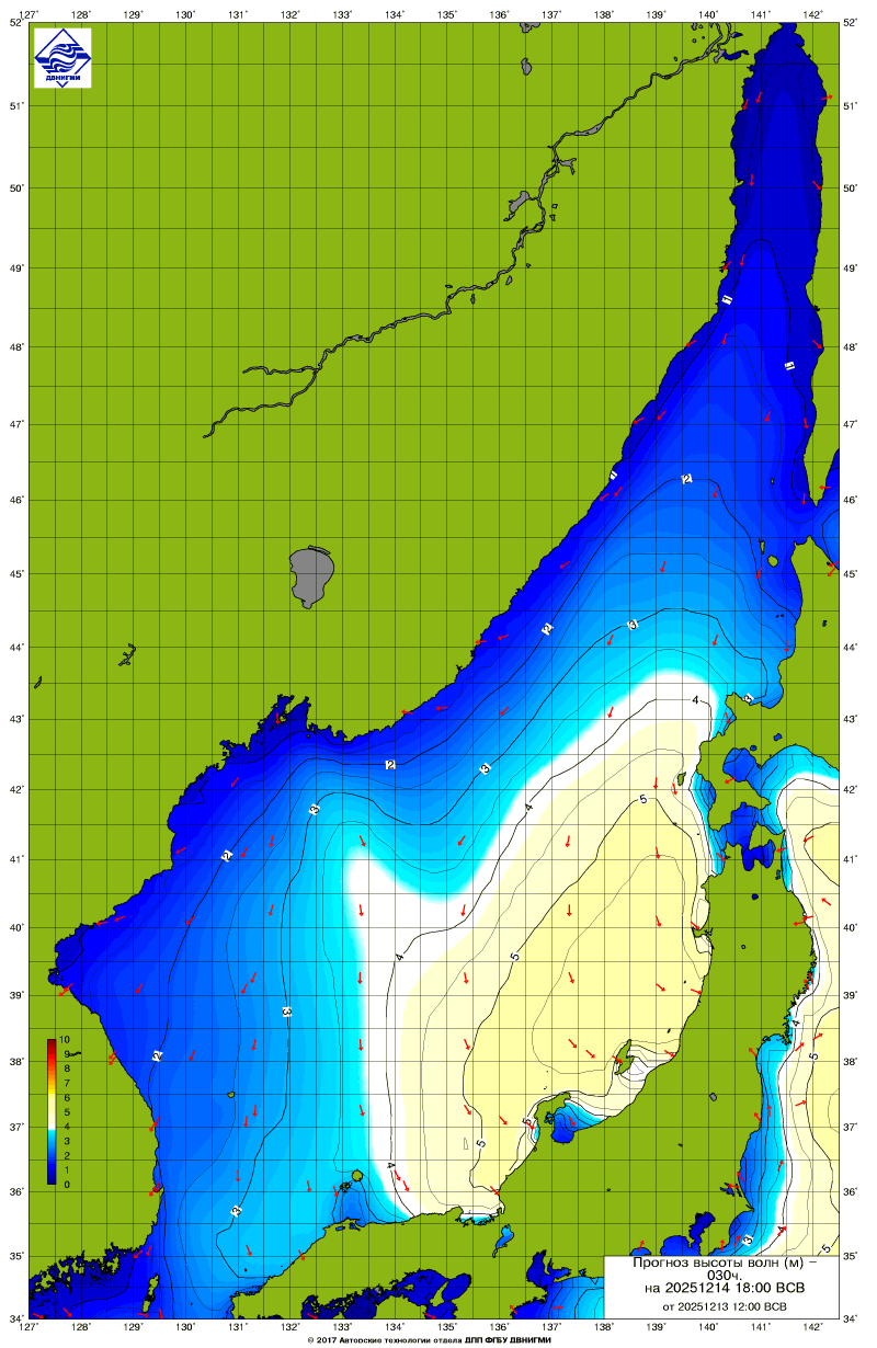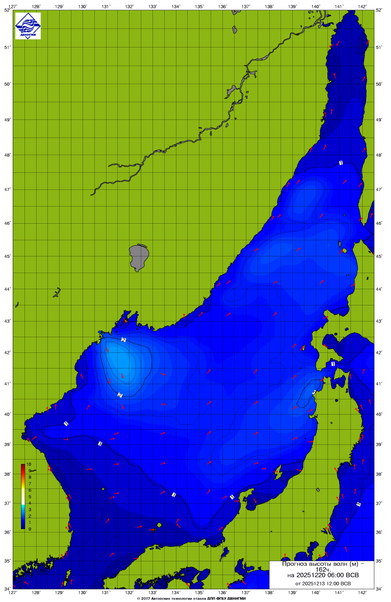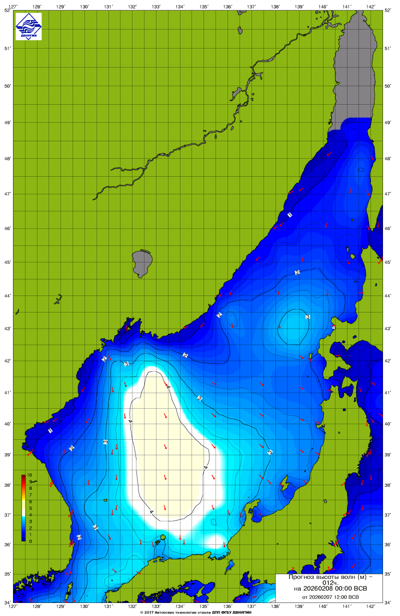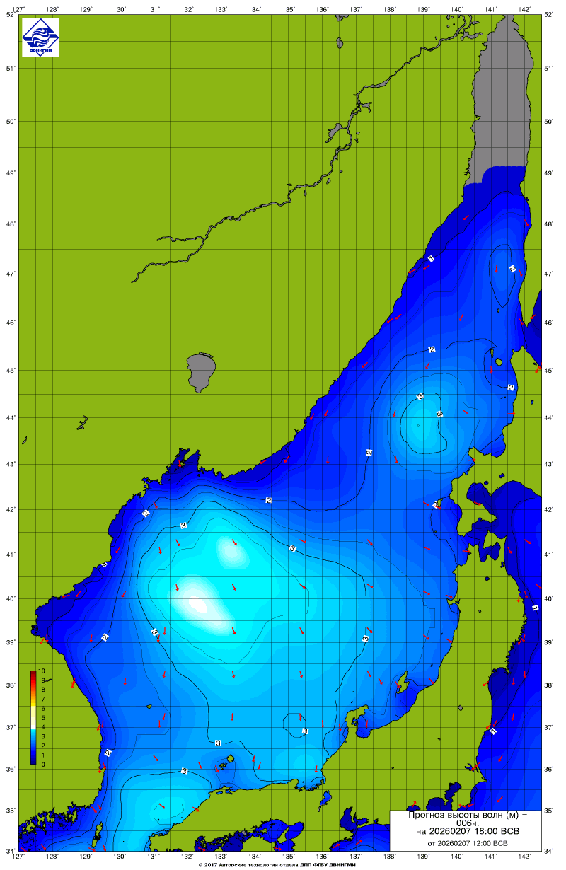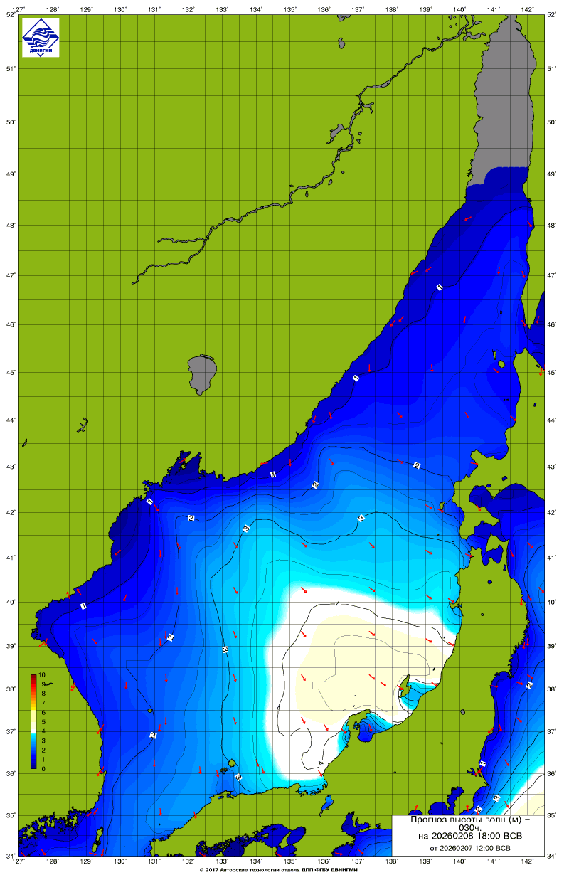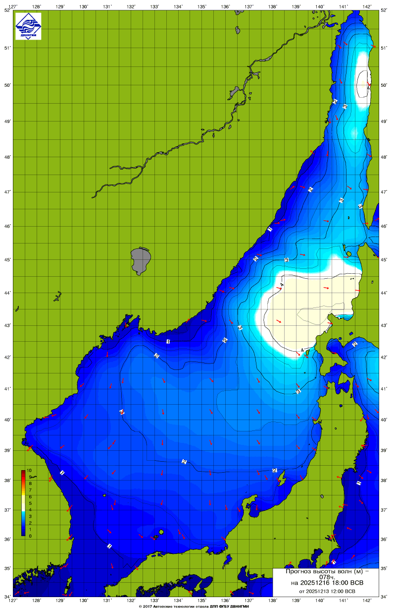 Прогноз на основе численной модели WW III является результатом научных исследований, проводящихся в ФГБУ "ДВНИГМИ".