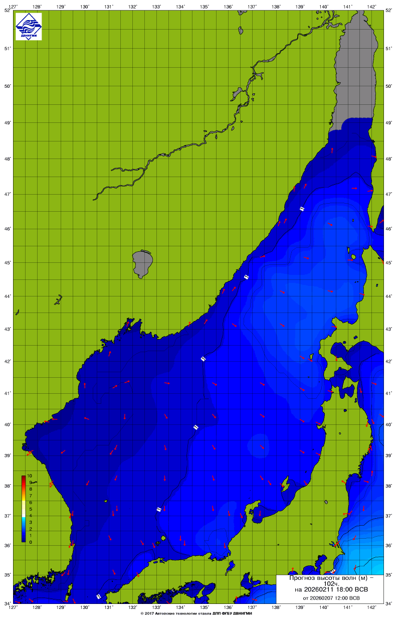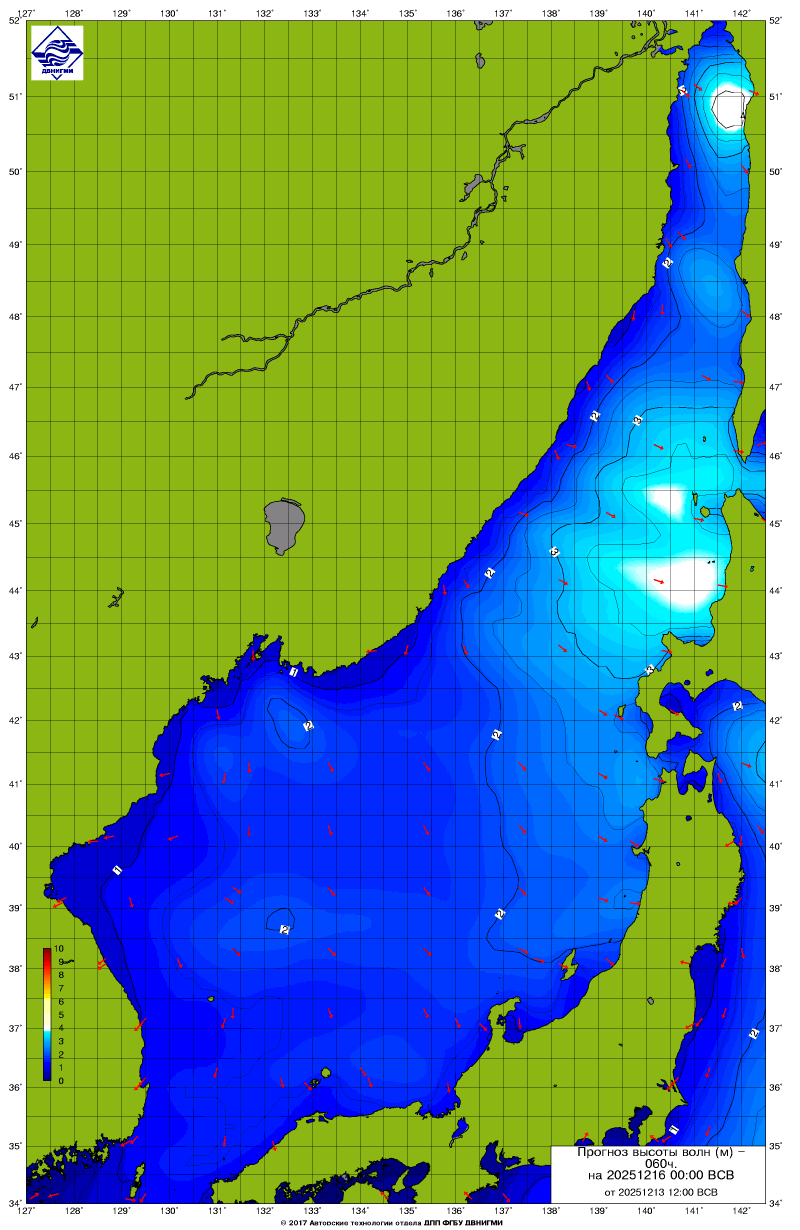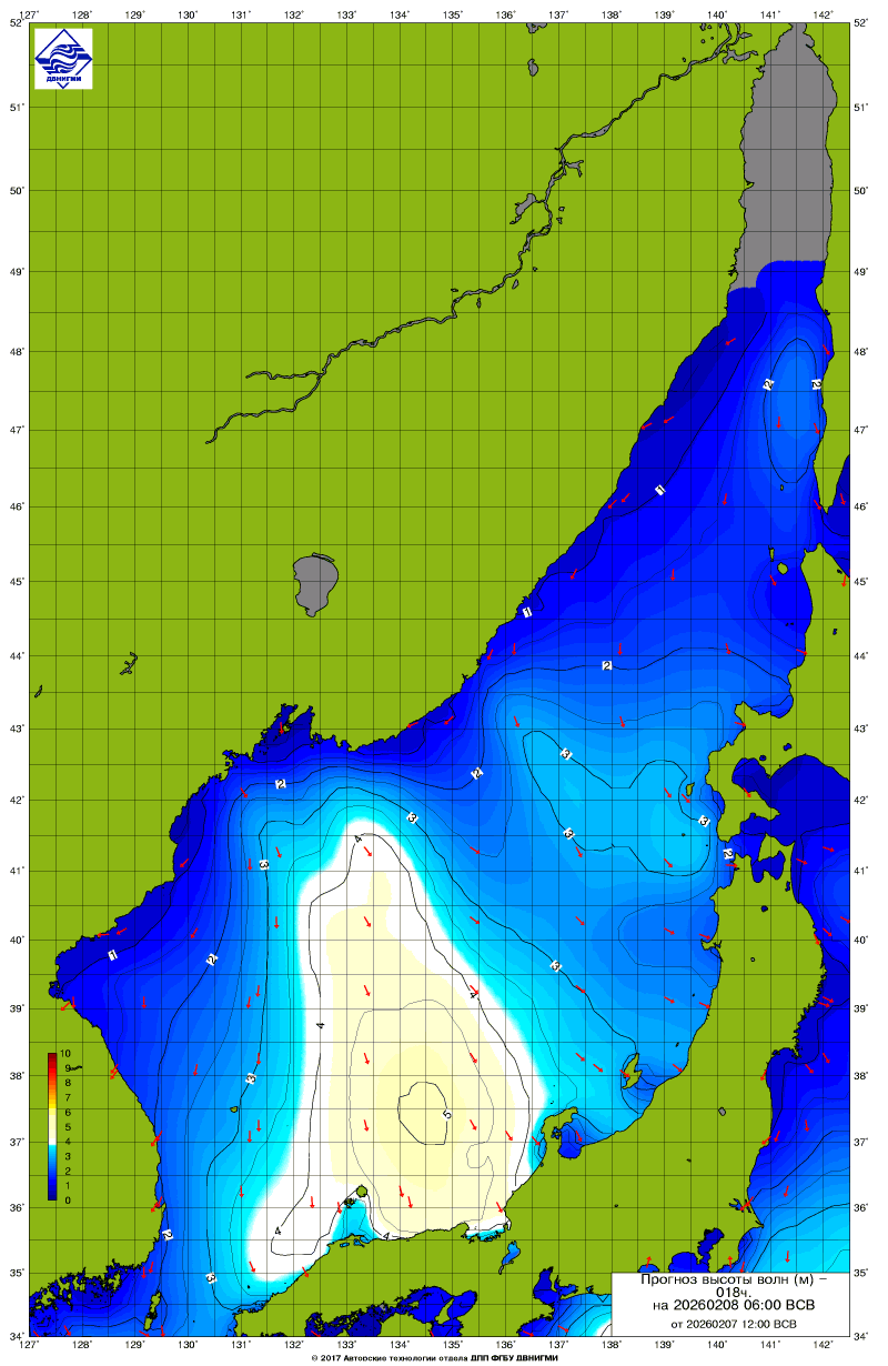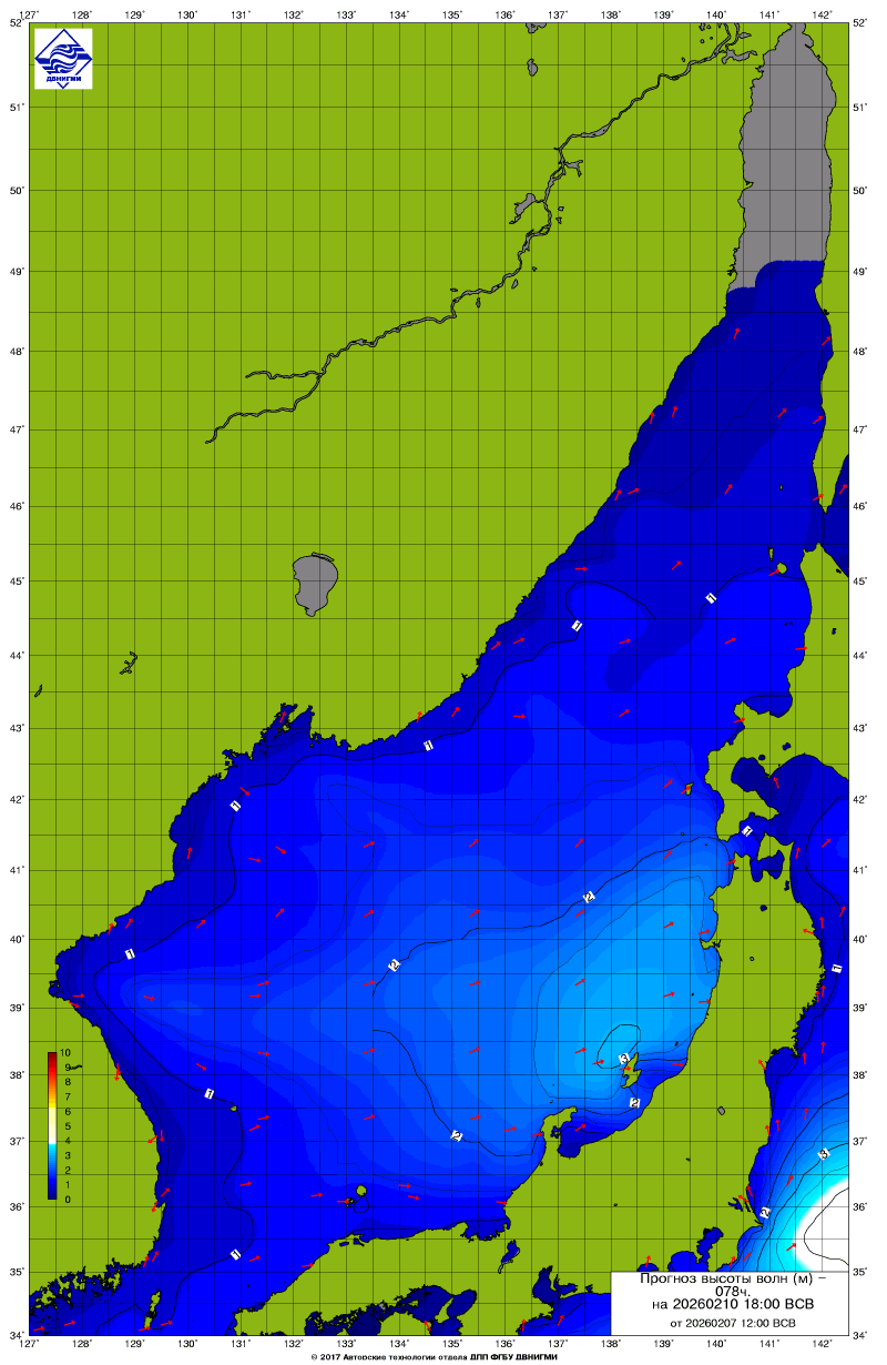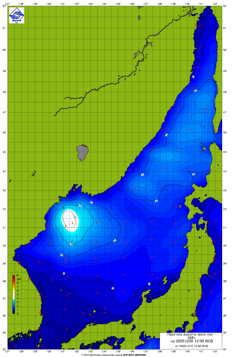 Прогноз на основе численной модели WW III является результатом научных исследований, проводящихся в ФГБУ "ДВНИГМИ".