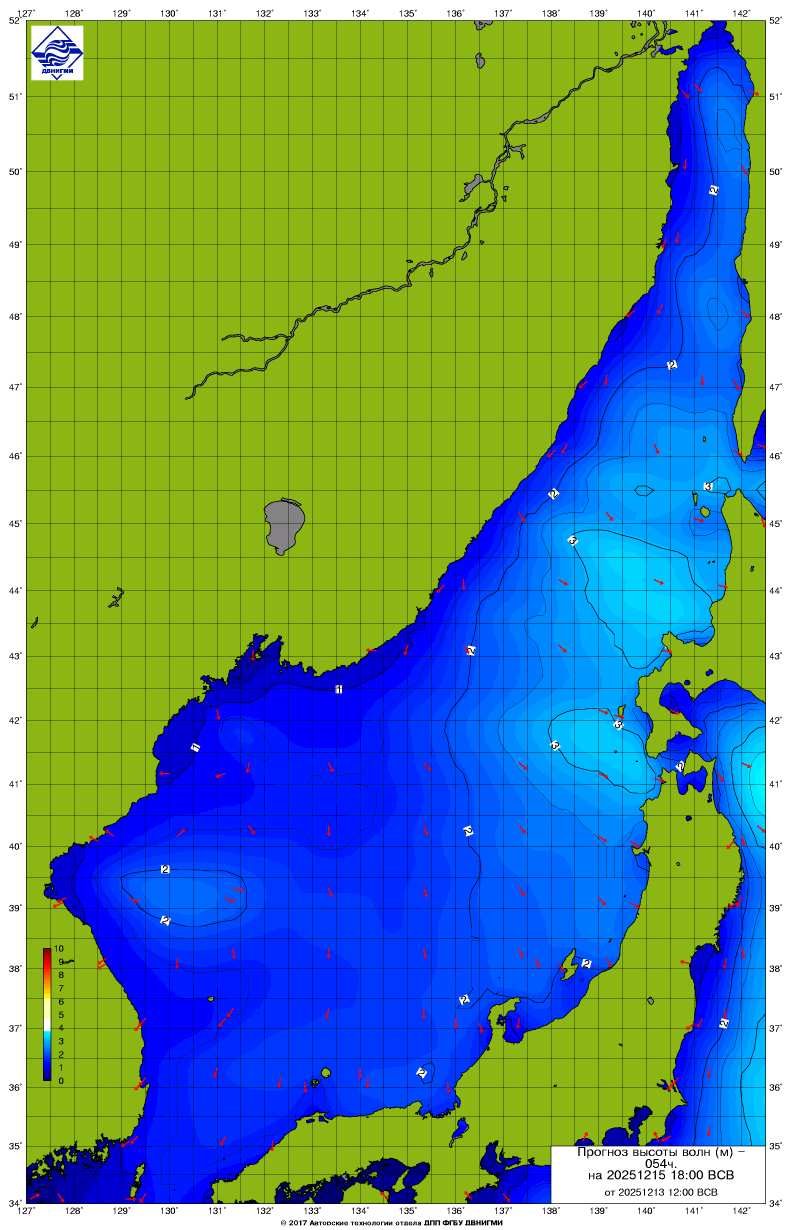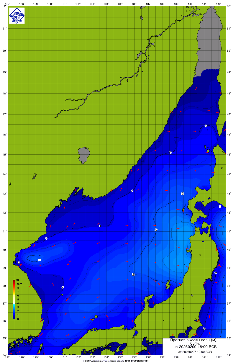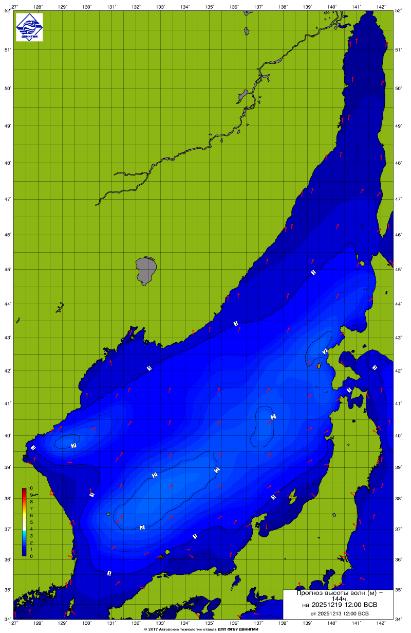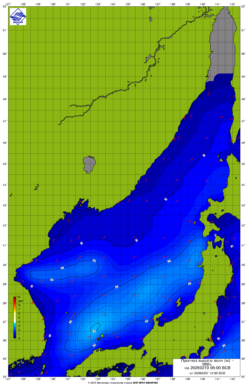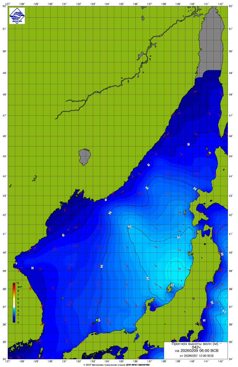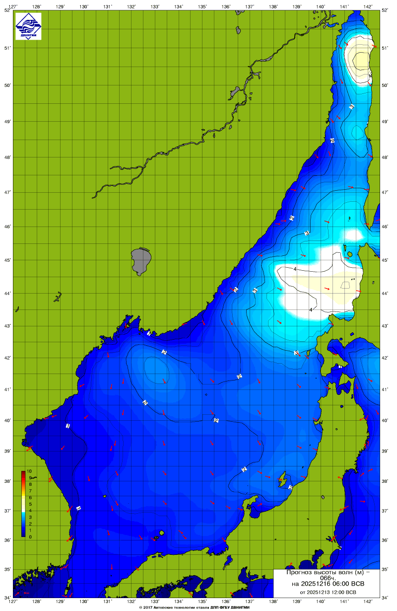 Прогноз на основе численной модели WW III является результатом научных исследований, проводящихся в ФГБУ "ДВНИГМИ".
