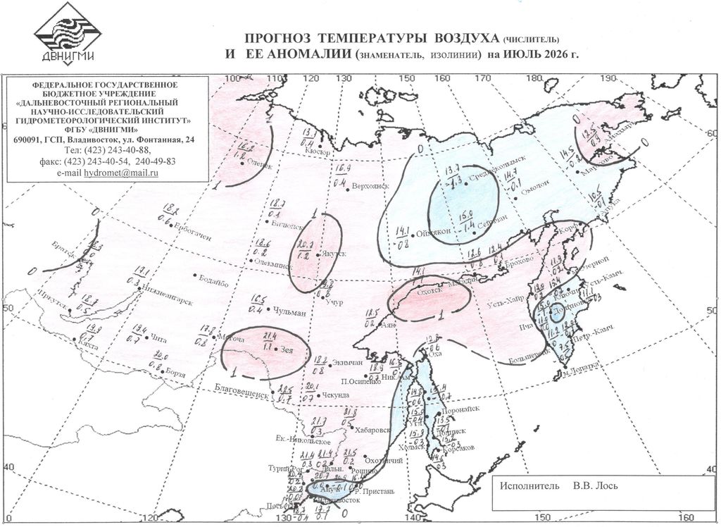 В отделе долгосрочных прогнозов погоды и изучения климата ДВНИГМИ под руководством Свинухова Г.В. был разработан метод прогноза аномалии температуры воздуха и осадков с 5 - месячной заблаговременностью для станций Восточной Сибири и Дальнего Востока. В декабре 1973 г. данный метод был утвержден Центральной методической комиссией и рекомендован к использованию в оперативной практике в качестве консультативного. С января 1974 г. и по настоящее время прогностические карты аномалии средней месячной температуры воздуха (ΔΤ) и сумм осадков (ΔR) регулярно составляются и рассылаются для использования во все управления гидрометслужбы на территории Восточной Сибири (ВС) и Дальнего Востока (ДВ).